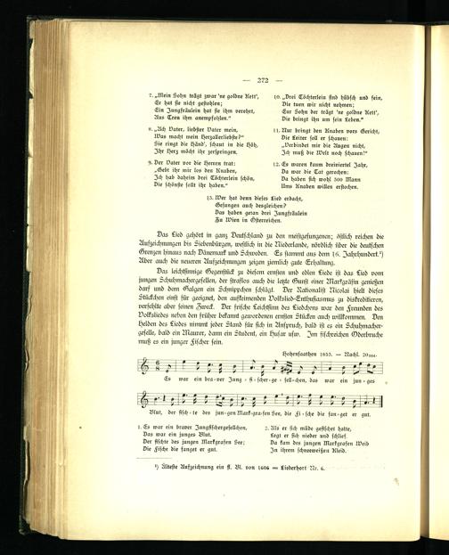 Das leichtsinnige Gegenstück zu diesem ernsten und edlen Liede ist das Lied vom jungen Schuhmachergesellen, der straflos auch die letzte Gunst einer Markgrüfin genießen darf und dem Galgen ein Schnippchen schlägt. Der Rationalist Nicolai hielt dieses Stückchen einst für geeignet, den aufkeimenden Volkslied-Enthusiasmus zu diskreditieren, verfehlte aber seinen Zweck. Der frische Leichtsinn des Liedchens war den Freunden des Volksliedes neben den früher bekannt gewordenen ernsten Stücken auch willkommen. Den Helden des Liedes nimmt jeder Stand für sich in Anspruch, bald ist es ein Schuhmachergeselle, bald ein Nkaurer, dann ein Student, ein Husar usw. Im fischreichen Vderbruche muß es ein junger Fischer sein.
