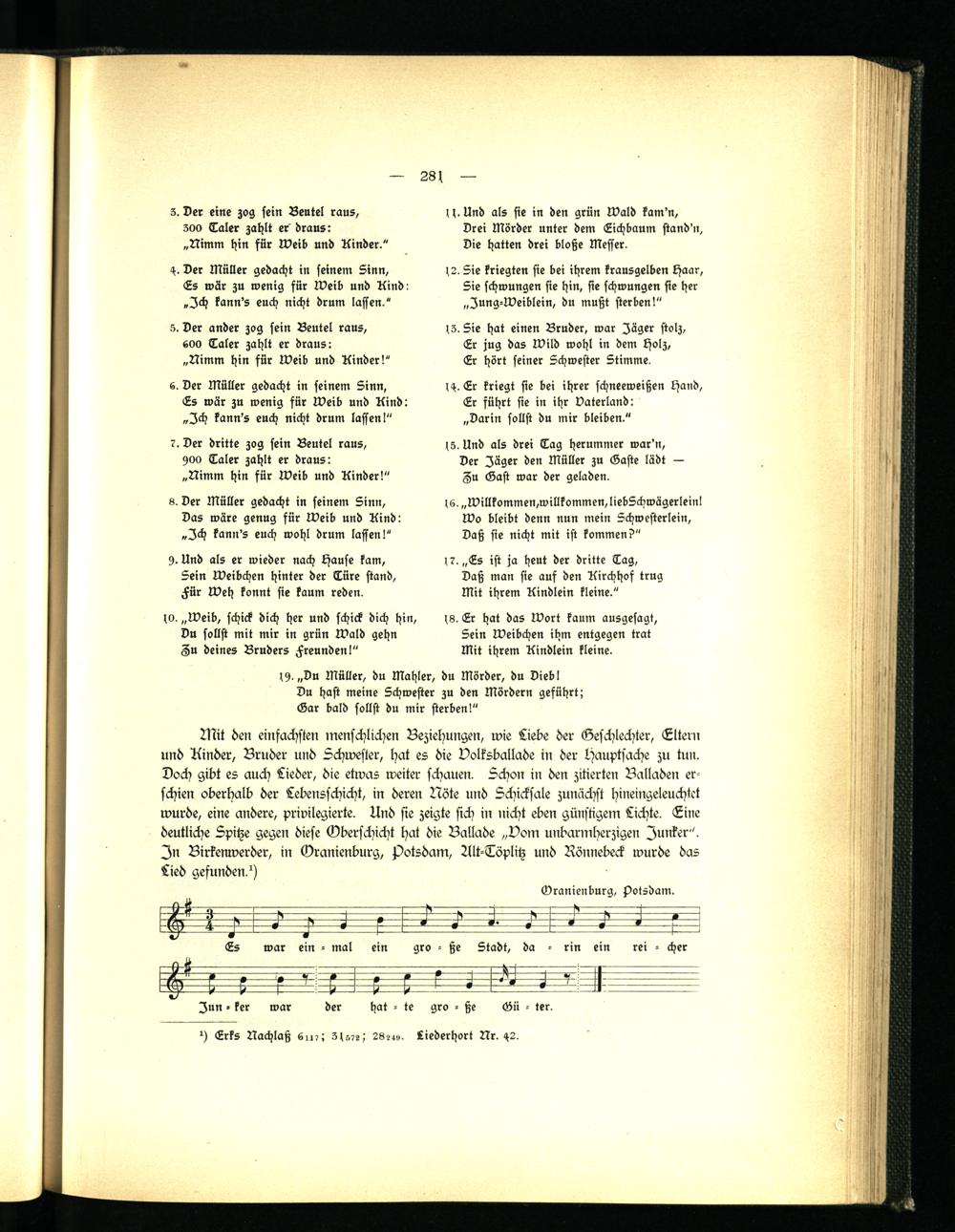 Mit den einfachsten menschlichen Beziehungen, wie Liebe der Geschlechter, Eltern und Kinder, Bruder und Schwester, hat es die Volksballade in der Hauptsache zu tu». Doch gibt es auch Lieder, die etwas weiter schauen. Schon in den zitierten Balladen erschien oberhalb der Lebensschicht, in deren Nöte und Schicksale zunächst hineingeleuchtet wurde, eine andere, privilegierte. Und sie zeigte sich in nicht eben günstigem Lichte. Eine deutliche Spitze gegen diese Oberschicht hat die Ballade „Vom unbarmherzigen Junker". In Birkenwerder, in Oranienburg, Potsdam, Alt-Töplitz und Rönnebeck wurde das Lied gefunden, h