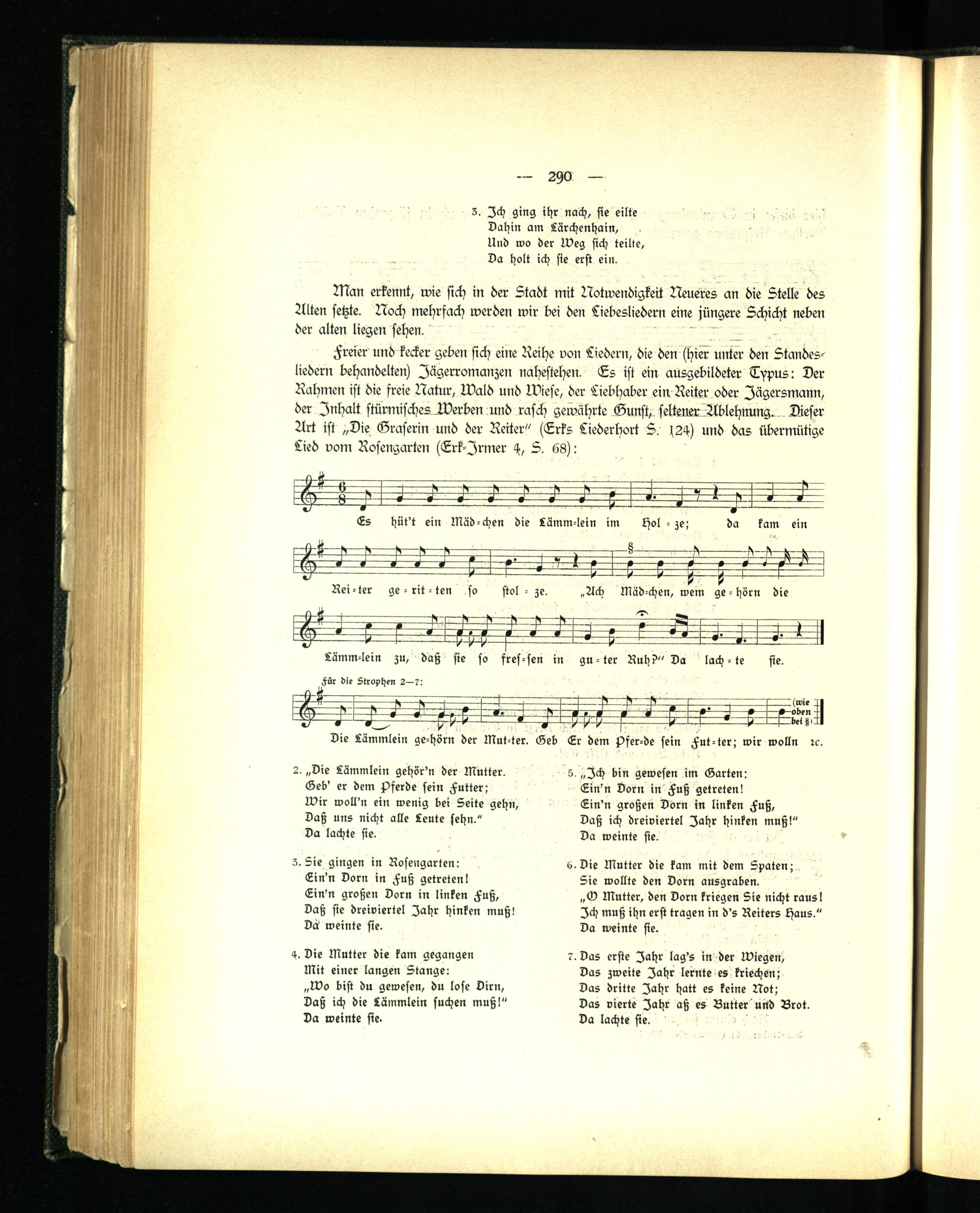 Freier und kecker geben sich eine Reihe von Liedern, die den (hier unter den Standesliedern behandelten) Iägerromanzen nahestehen. <Ls ist ein ausgebildeter Typus: Der Rahmen ist die freie Natur, U)ald und Miese, der Liebhaber ein Reiter oder Jägersmann, der Inhalt stürmisches Werben und rasch gewährte Gunst, seltener Ablehnung. Dieser Art ist „Die Graserin und der Reiter" (Lrks Liederhort S. s24) und das übermütige Lied vom Rosengarten (Trk-Irmer 4, S. 68):