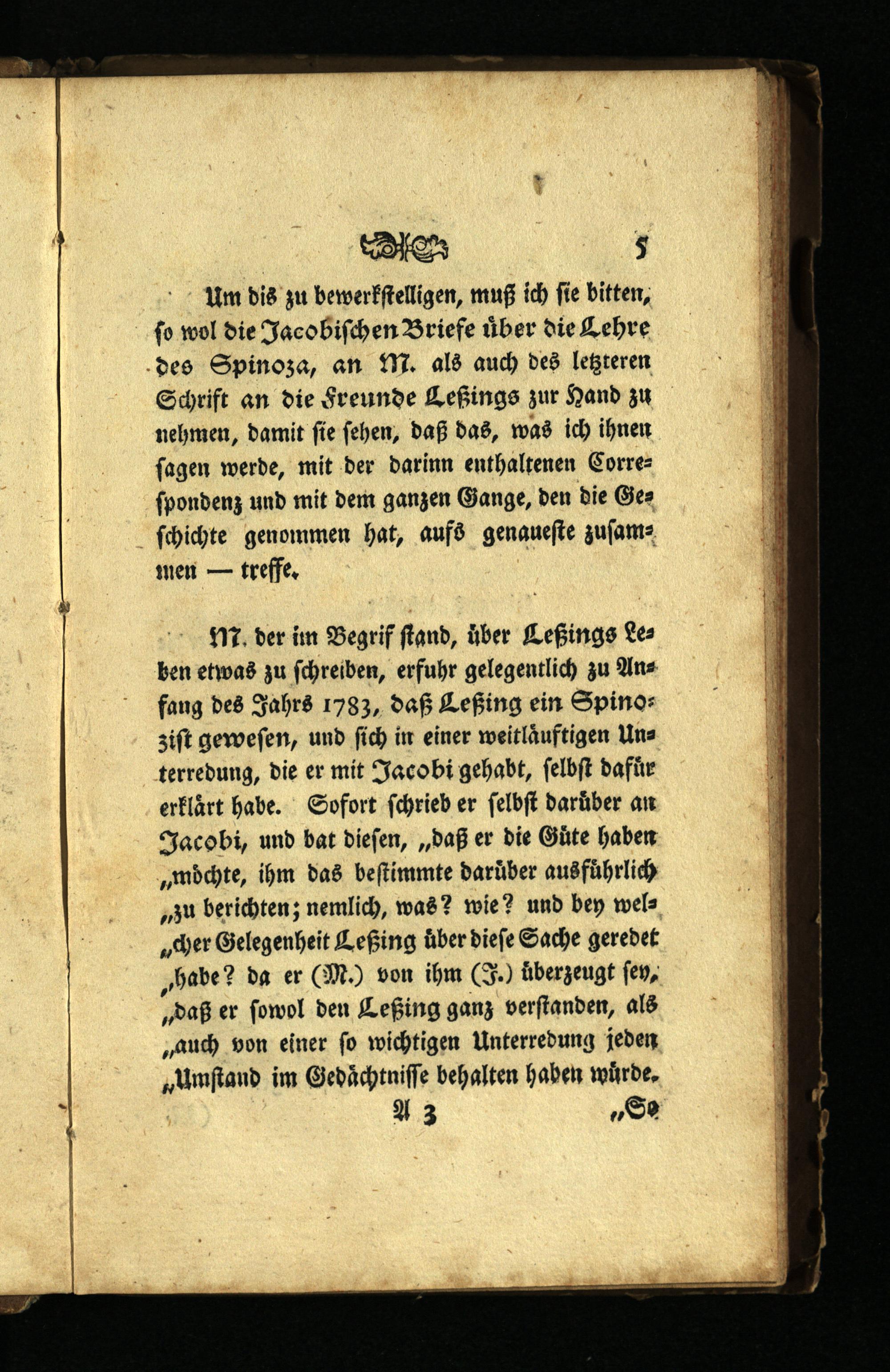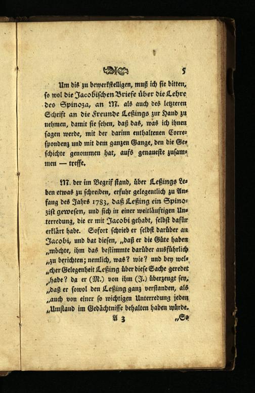 Um dis zu bewerkſtelligen, muß ich fie bitten, ſo wol die Jacobiſchen Briefe uͤber die Lehre des Spinoza, an M. als auch des letzteren Schrift an die Freunde Leßings zur Hand zu nehmen, damit ſie ſehen, daß das, was ich ihnen ſagen werde, mit der darinn enthaltenen Correſpondenz und mit dem ganzen Gange, den die Geſchichte genommen hat, aufs genaueſte zuſammen— treffe.