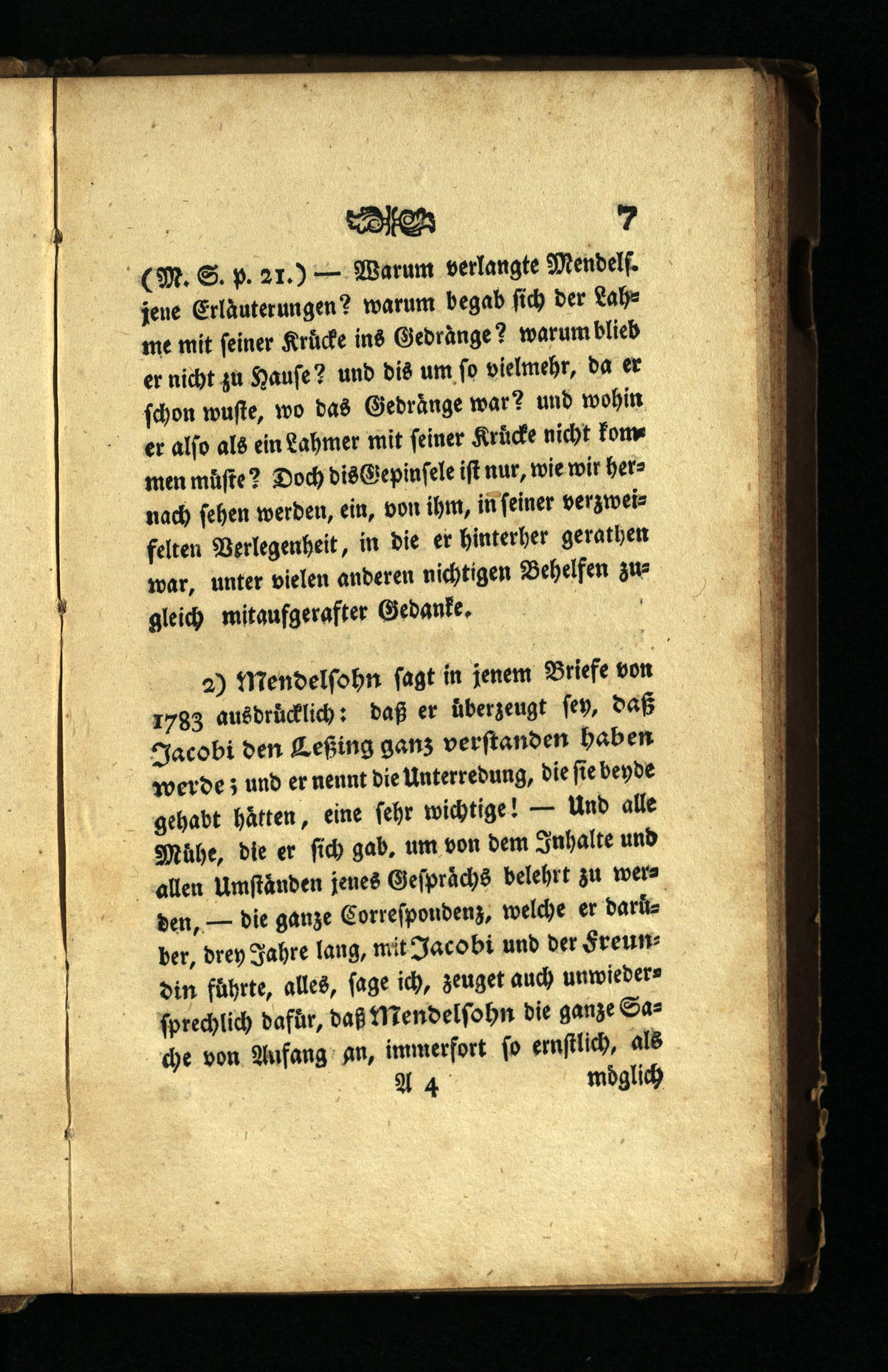 2) Mendelſohn ſagt in jenem Briefe von 1783 ausdrücklich: daß er überzeugt ſey, daß Jacobi den Leßing ganz verſtanden haben werde; und er nennt die Unterredung, die fie beyde gehabt hätten, eine ſehr wichtige!— Und alle Mühe, die er ſich gab. um von dem Inhalte und allen Umſtaͤnden jenes Geſpraͤchs belehrt zu werden,— die ganze Correſpondenz, welche er daruͤber, drey Jahre lang, mit Jacobi und der Freundin führte, alles, ſage ich, zeuget auch unwiederſprechlich dafür, daß Mendelſohn die ganze Sache von Aufang an, immerfort ſo ernſtlich, als