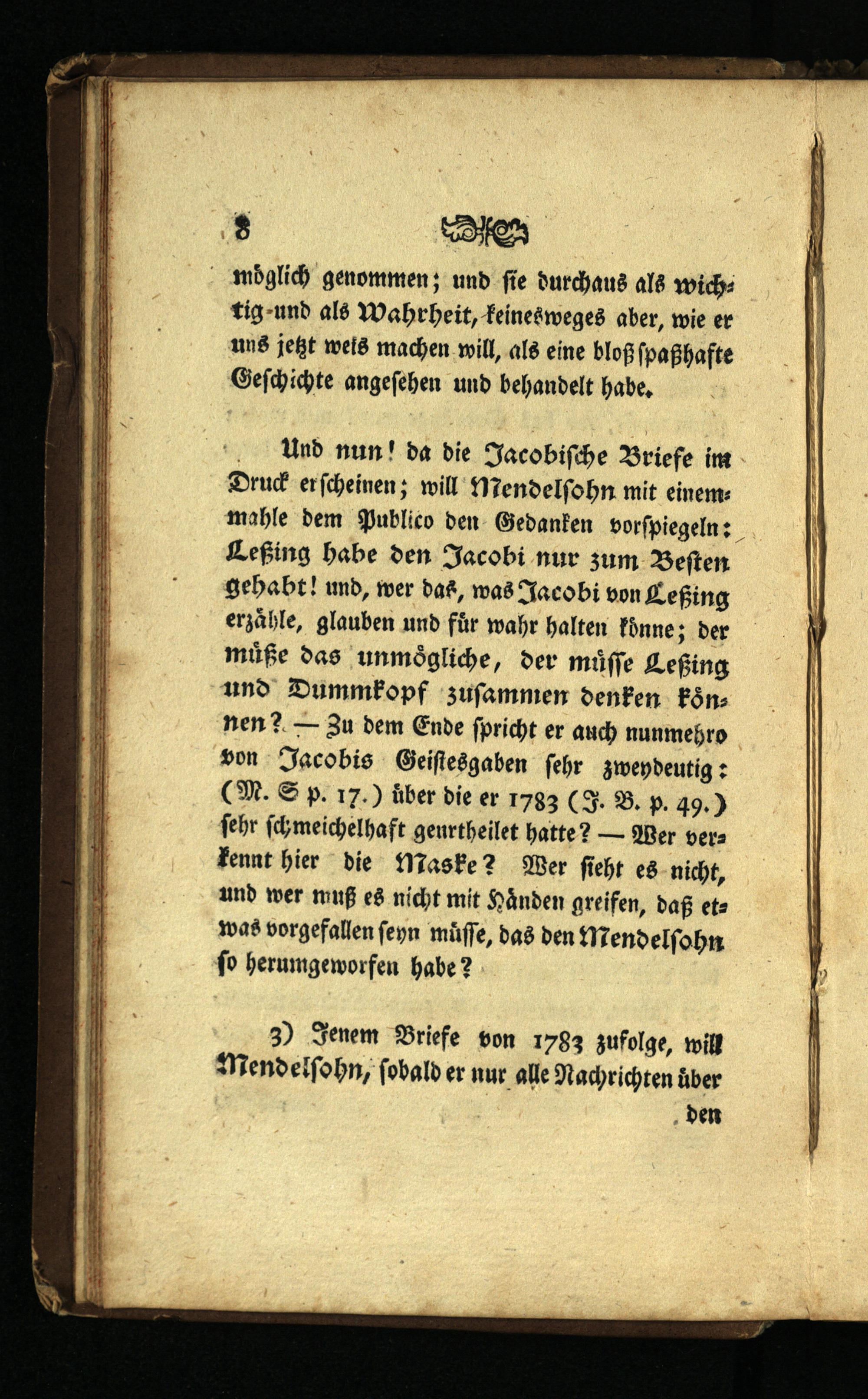 Und nun! da die Jacobiſche Briefe im Druck erſcheinen; will Mendelſohn mit einemmahle dem Publico den Gedanken vorſpiegeln: Ceßing habe den Jacobi nur zum Beſten gehabt! und, wer das, was Jacobi von Ceßing erzähle, glauben und für wahr halten koͤnne der muͤße das unmoͤgliche, der muͤſſe Ceßing und Dummkopf zuſammen denken Fön: nen?— Zu dem Ende ſpricht er auch nunmehro von Jacobis Geiſtesgaben ſehr zweydeutig: ¶ M. Sp. 17.) über die er 1783(J. B. p. 49.) ſehr ſchmeichelhaft geurtheilet hatte?— Wer verkennt hier die Maske? Wer ſieht es nicht, und wer muß es nicht mit Haͤnden greifen, daß etwas vorgefallen ſeyn muͤſſe, das den Mendelſohn ſo herumgeworfen habe?
