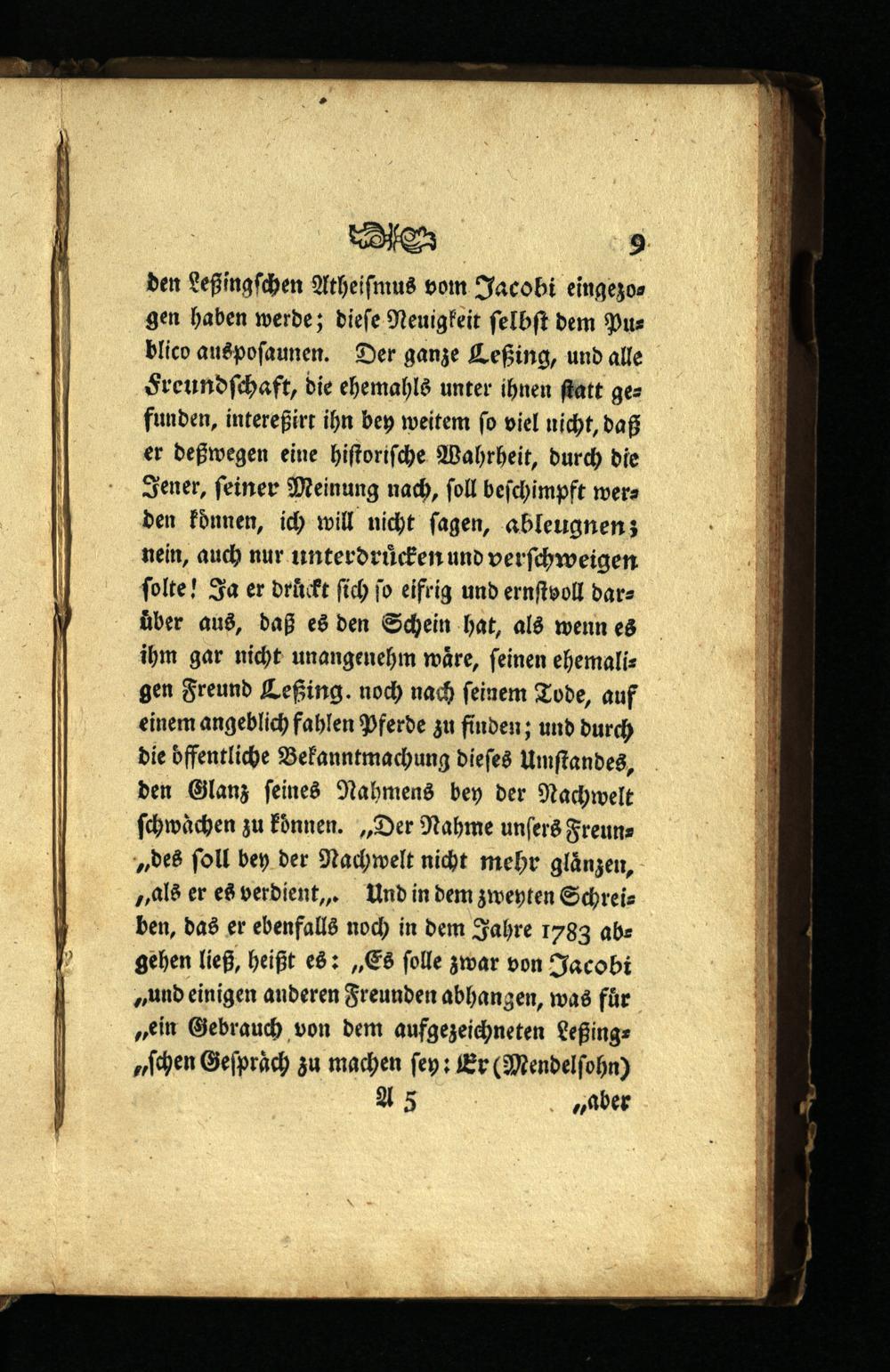 den Leßingſchen Atheiſmus vom Jacobi eingezogen haben werde; dieſe Neuigkeit ſelbſt dem Publico auspoſaunen. Der ganze Ceßing, und alle Freundſchaft, die ehemahls unter ihnen ſtatt gefunden, intereßirt ihn bey weitem ſo viel nicht, daß er deßwegen eine hiſtoriſche Wahrheit, durch die Jener, ſeiner Meinung nach, ſoll beſchimpft werden koͤnnen, ich will nicht ſagen, ableugnen; nein, auch nur unterdruͤcken und verſchweigen ſolte! Ja er druckt ſich ſo eifrig und ernſtvoll darüber aus, daß es den Schein hat, als wenn es ihm gar nicht unangenehm wäre, feinen ehemaligen Freund Ceßing. noch nach feinem Tode, auf einem angeblich fahlen Pferde zu finden; und durch die dffentliche Bekanntmachung dieſes Umſtandes, den Glanz ſeines Nahmens bey der Nachwelt ſchwaͤchen zu konnen.„Der Nahme unſers Freun„des ſoll bey der Nachwelt nicht mehr glänzen, „als er es verdient, Und in dem zweyten Schreiben, das er ebenfalls noch in dem Jahre 1783 abe gehen ließ, heißt es:„Es ſolle zwar von Jacobi „und einigen anderen Freunden abhangen, was fuͤr „ein Gebrauch von dem aufgezeichneten Leßingevchen Geſpraͤch zu machen ſey: Er(Nendelſohn)
