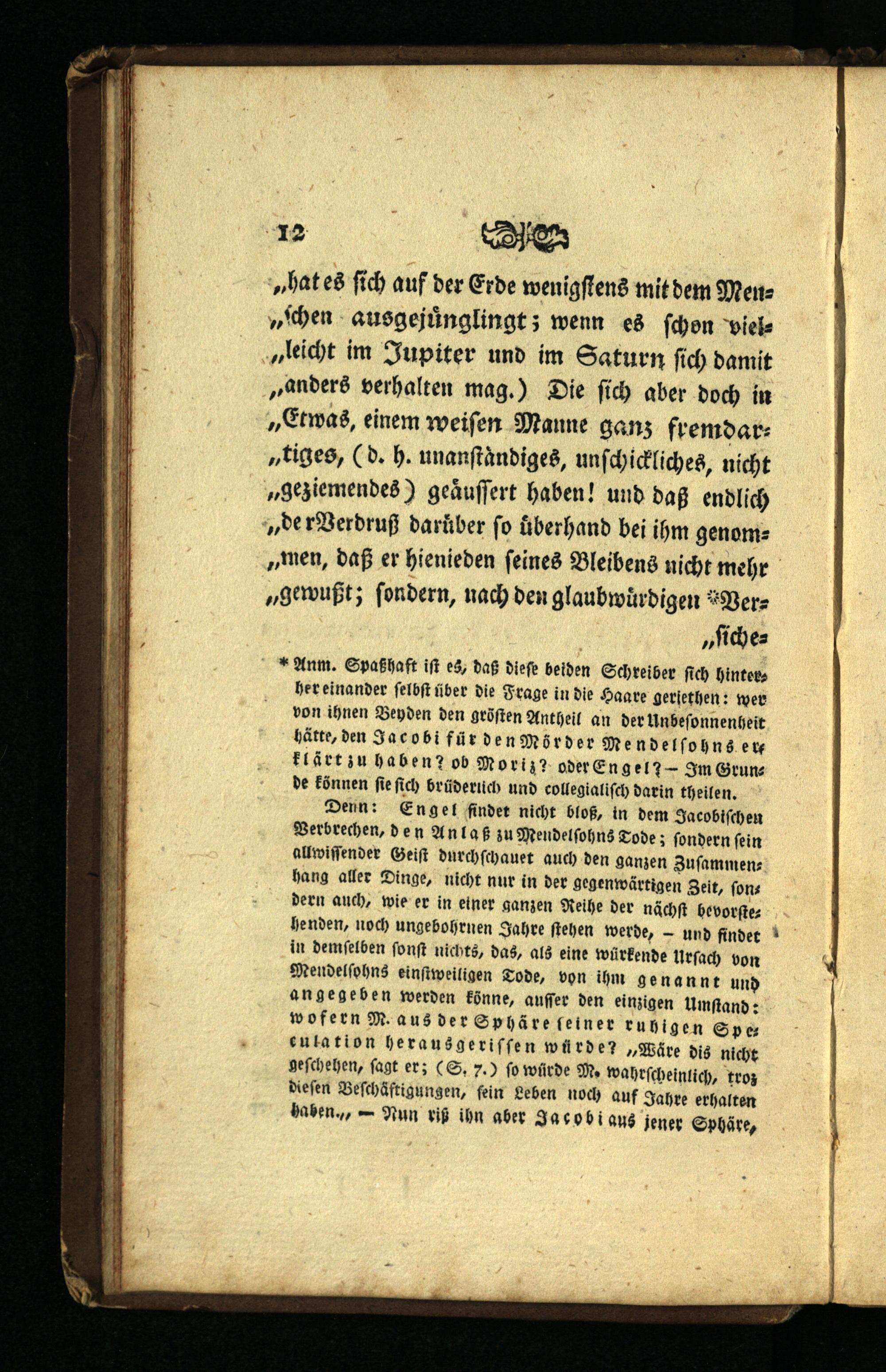 her einander ſelbſt über die Frage in die Haare geriethen: wer von ihnen Beyden den gröſten Antheil an der Unbeſonnenheit hätte, den Jacobi für den Mörder Mendelſohns erklärt zu haben? ob Moriz? oder Eng el 7= Im Grunde können ſie ſich brüderiich und collegialiſch darin theilen. Denn: Eng el findet nicht bloß, in dem Jacobiſchen Verbrechen, den Anlaß zu Mendelſohns Tode; ſondern ſein allwiſſender Geiſt durchſchauet auch den ganzen Zuſammenhang aller Dinge, nicht nur in der gegenwärtigen Zeit, ſondern auch, wie er in einer ganzen Reihe der nächſt he vorſtehenden, noch ungebohrnen Jahre ſtehen werde,— und findet in demſelben ſonſt nichts, das, als eine würkende Urſach von Mendelſohns einſtweiligen Tode, von ihm genannt und angegeben werden könne, auſſer den einzigen Umſtand: wo fern Maus der Sphäre feiner ruhigen Speeulation herausgeriſſen würde?„Wäre dis nicht geſchehen, ſagt er;(S. 7.) ſo würde M. wahrſcheinlich, troz dieſen Beſchäftigungen, fein Leben noch auf Jahre erhalten haben.,— Nun riß ihn aber Jacobi aus jener Sphäre,