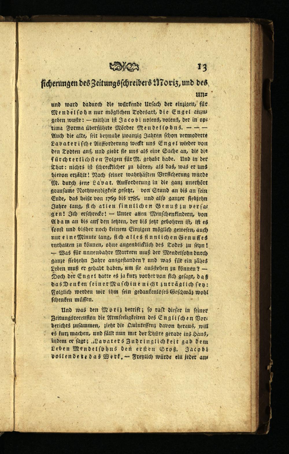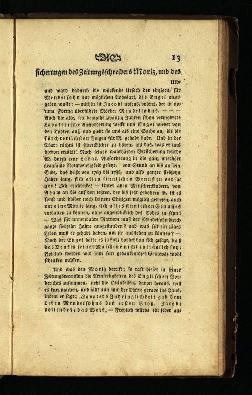 unund ward dadurch die würkende Urſach der einzigen, für Mendel ſo hn nur möglichen Todesart, die Eng el anzugeben wuſte:— mithin iſt Ja co bi nolens, volens, der in op tima Forma überführte Mörder Mendel ſohn s.——— Auch die aſte, ſeit beynahe zwanzig Jahren ſchon vermoderte Lavateriſche Aufforderung weckt uns Eng el wieder von den Todten anf, und giebt ſie uns als eine Sache an, die die fürchterlich ſten Folgen für M. gehabt habe. Und in der That: nichts iſt ſchrecklicher zu hören, als das, was er uns hievon erzählt! Nach ſeiner wahrhaften Verſicherung wurde M. durch jene Lavat. Aufforderung in die ganz unerhört grauſame Nothwendigkeit geſetzt, von Stund an bis an fein Ende, das heißt von 1769 bis 1785, und alſo ganzer ſiebzehn Jahre lang, ſich allen ſinnlichen Genuß zu verſagen! Ich erſchrecke!— Unter allen Menſchenkindern, von Adam an bis anf den letzten, der bis jetzt gebohren iſt, iſt es ſonſt und bisher noch keinem Einzigen möglich geweſen, auch nur e ine Minute lang, ſich alles ſinnlichen Genuſſes enthalten zu können, ohne augenblicklich des Todes zu ſeyn! — Was für unnenbahre Martern muß der Mendelſohn durch ganze ſiebzehn Jahre ausgeſtanden? und was füt ein zähes Teben muß er gehabt haben, um ſie ausſtehen zu können?— Doch der Engel hatte es ja kurz vorher von ſich geſagt, daß das Denken feiner Maſchine nicht zuträalich ſey: Folglich werden wir ihm fein gedankenloſes Geſchwäz wohl ſchenken müſſen.