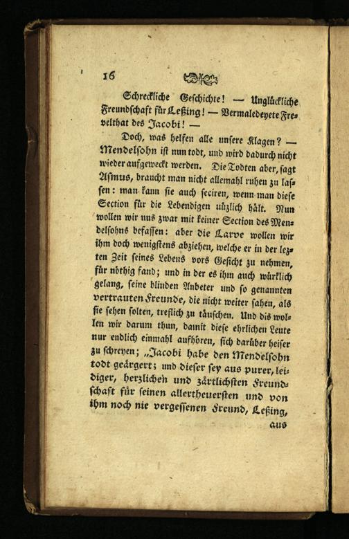 Doch, was helfen alle unſere Klagen?— Mendelſohn iſt nun todt, und wird dadurch nicht wieder aufgeweckt werden. Die Todten aber, ſagt Aſmus, braucht man nicht allemahl ruhen zu laſſen: man kann ſie auch ſeciren, wenn man dieſe Section fuͤr die Lebendigen unzlich hält. Nun wollen wir nus zwar mit keiner Section des Mendelſohns befaſſen: aber die Larve wollen wir ihm doch wenigſtens abziehen, welche er in der lezten Zeit ſeines Lebens vors Geſicht zu nehmen, für noͤthig fand; und in der es ihm auch würklich gelang, ſeine blinden Anbeter und ſo genannten vertrauten Freunde, die nicht weiter ſahen, als fie ſehen ſolten, treflich zu taͤuſchen. Und dis wollen wir darum thun, damit dieſe ehrlichen Leute nur endlich einmahl aufhören, ſich darüber heiſer zu ſchreyen; Jacobi habe den Mendelſohn todt geaͤrgert; und dieſer ſey aus purer, leidiger, herzlichen und zaͤrtlichſten Freundſchaft für feinen allertheuerſten und von ihm noch nie vergeſſenen Freund, Leßing,