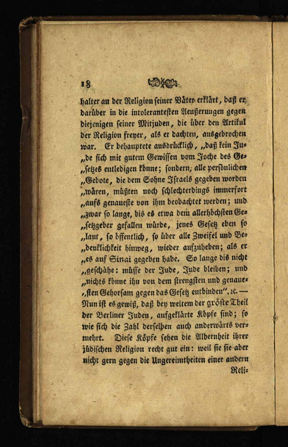 halter an der Religion feiner Vaͤter erklärt, daß er daruber in die intoleranteſten Aeußerungen gegen diejenigen feiner Mitjuden, die über den Artikul der Religion freyer, als er dachten, ausgebrochen war. Er behauptete ausdrücklich,„daß kein Ju„de ſich mit gutem Gewiſſen vom Joche des Ge„etzes entledigen koͤnne; ſondern, alle perſdnlichen „Gebote, die dem Sohne Iſraels gegeben worden „waͤren, müßten noch ſchlechterdings immerfort „aufs genaueſte von ihm beobachtet werden; und „zwar ſo lange, bis es etwa dem allerhöchſten Ges „ſetzgeber gefallen wurde, jenes Geſetz eben ſo „laut, fo dͤffentlich, fo über alle Zweifel und Des „denklichkeit hinweg, wieder aufzuheben; als er „es auf Sinai gegeben habe. So lange dis nicht „geſchaͤhe: müſſe der Jude, Jude bleiben; und „nichts koͤnne ihn von dem ſtrengſten und genaue„ſten Gehorſam gegen das Geſetz entbinden. 1. Nun iſt es gewiß, daß bey weitem der groͤſte Theil der Berliner Juden, aufgeklaͤrte Köpfe find; ſo wie ſich die Zahl derſelben auch anderwaͤrts vermehrt. Dieſe Köpfe ſehen die Albernheit ihrer jüdiſchen Religion recht gut ein: weil fie ſie aber nicht gern gegen die Ungereimtheiten einer andern