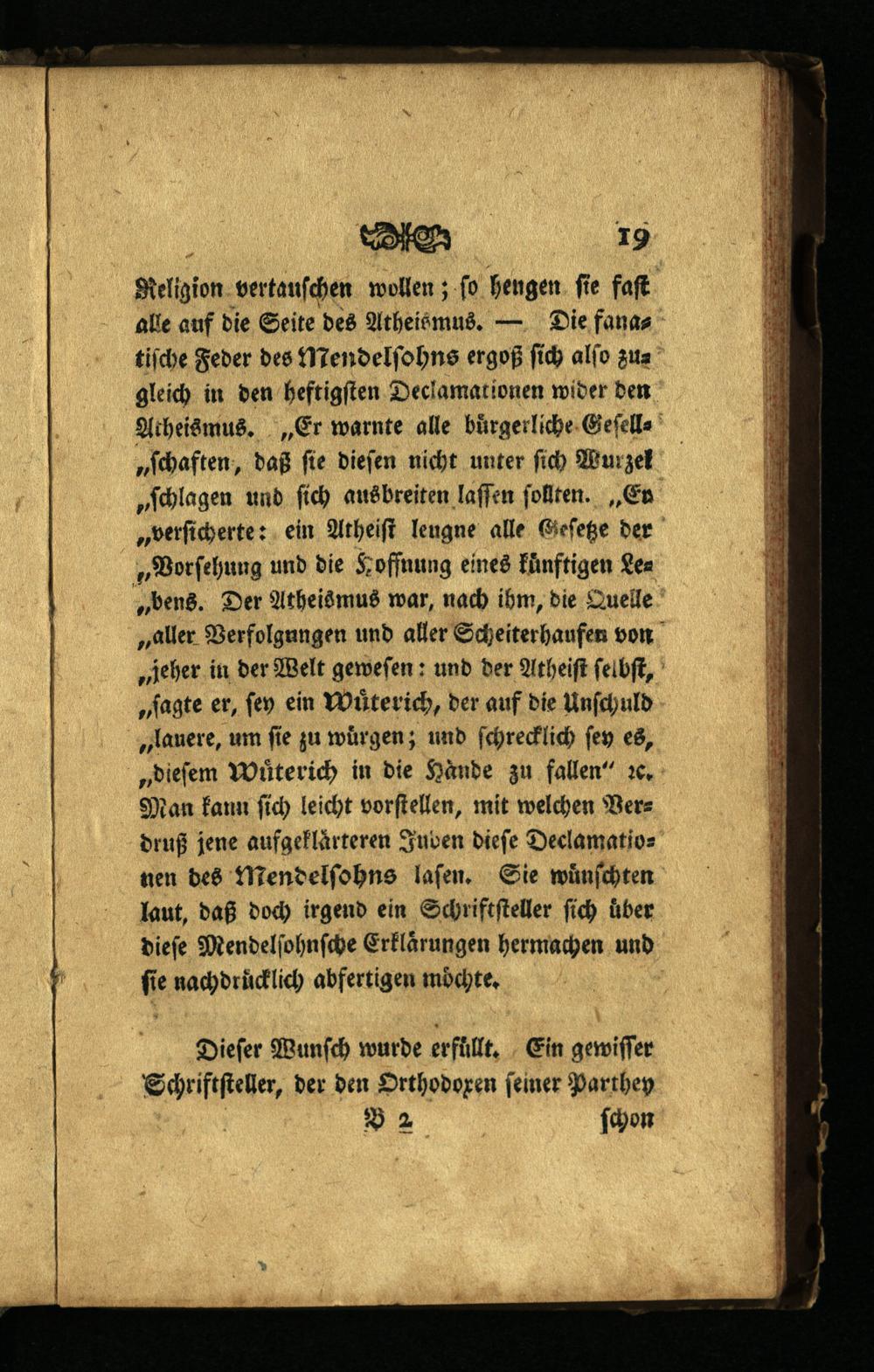 zu 19 Religion vertauſchen wollen; ſo hengen ſie faſt alle auf die Seite des Atheismus.— Die fanatiſche Feder des Mendelſohns ergoß ſich alſo zugleich in den heftigſten Declamationen wider den