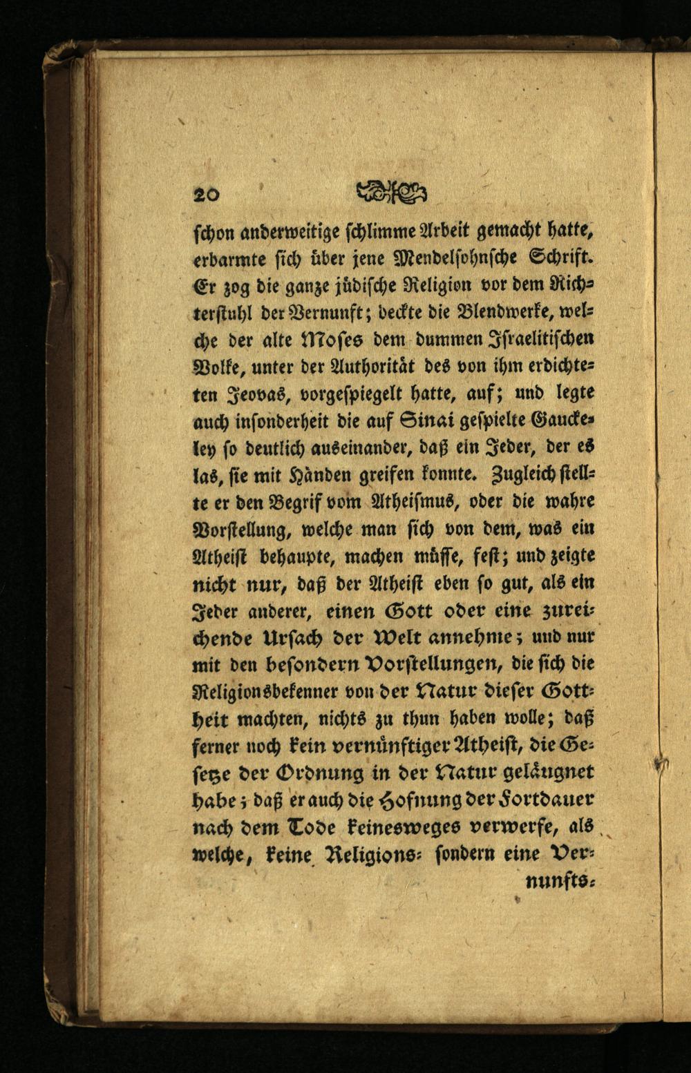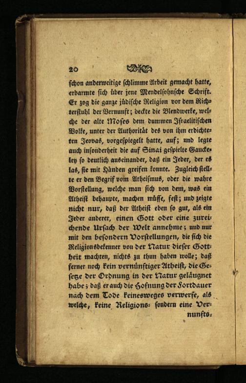 ſchon anderweitige ſchlimme Arbeit gemacht hatte, erbarmte ſich über jene Mendelſohnſche Schrift. Er zog die ganze juͤdiſche Religion vor dem Rich» terſtuhl der Vernunft; deckte die Blendwerke, welche der alte Moſes dem dummen Iſraelitiſchen Volke, unter der Authoritaͤt des von ihm erdichteten Jeovas, vorgeſpiegelt hatte, auf; und legte auch inſonderheit die auf Sinai geſpielte Gauckeley ſo deutlich auseinander, daß ein Jeder, der es las, fie mit Handen greifen konnte. Zugleich ſtellte er den Begrif vom Atheiſmus, oder die wahre Vorſtellung, welche man ſich von dem, was ein Atheiſt behaupte, machen muͤſſe, feſt; und zeigte nicht nur, daß der Atheiſt eben ſo gut, als ein Jeder anderer, einen Gott oder eine zureichende Urſach der Welt annehme; und nur mit den beſondern Vorſtellungen, die ſich die Religion sbekenner von der Natur dieſer Gottheit machten, nichts zu thun haben wolle; daß ferner noch kein vernünftiger Atheiſt, die Ge: ſetze der Ordnung in der Natur gelaͤugnet habe; daß er auch die Hofnung der Fortdauer