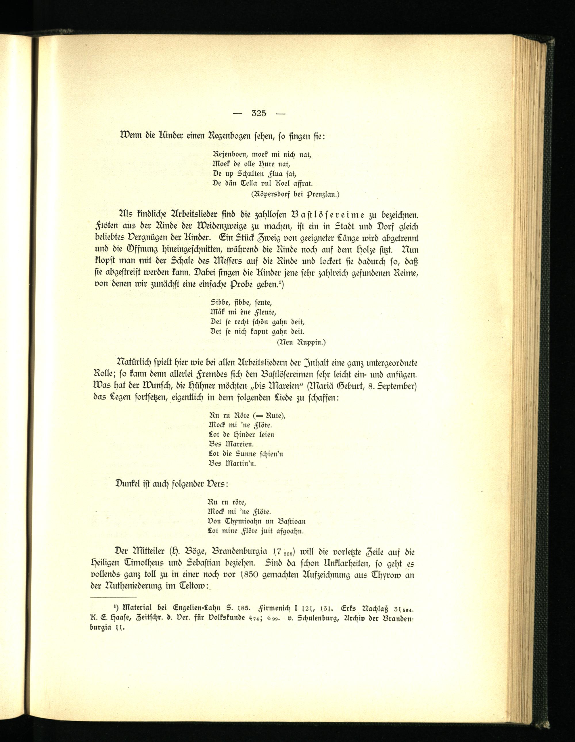 Als kindliche Arbeitslieder sind die zahllosen Bastlösereime zu bezeichnen. Flöten aus der Rinde der Weidenzweige zu machen, ist ein in Stadt und Dorf gleich beliebtes Vergnügen der Kinder. Lin Stück Zweig von geeigneter Länge wird abgetrennt und die Öffnung hineingeschnitten, während die Rinde noch auf dem Holze sitzt. Nun klopft man mit der Schale des Messers auf die Rinde und lockert sie dadurch so, daß sie abgestreift werden kann. Dabei singen die Kinder jene sehr zahlreich gefundenen Reime, von denen wir zunächst eine einfache Probe geben?)
