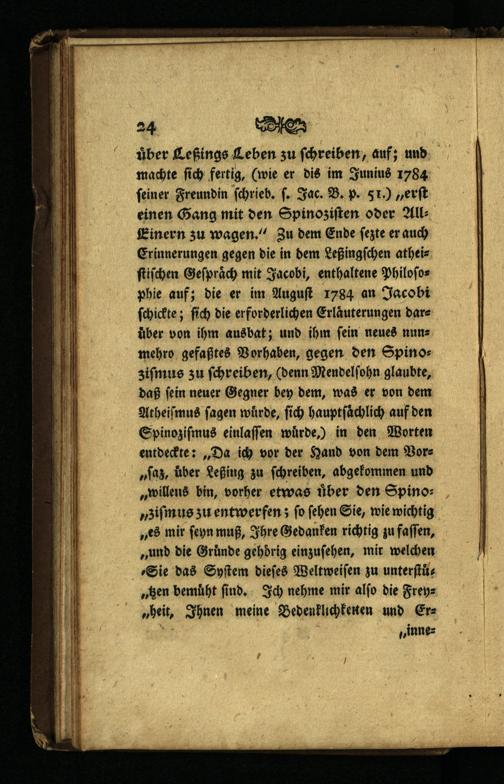 über Ceßings Leben zu ſchreiben, auf; und machte ſich fertig,(vie er dis im Junius 1784 feiner Freundin ſchrieb. ſ. Jac. B. p. 51)„erſt einen Gang mit den Spinoziſten oder AllEinern zu wagen.“ Zu dem Ende ſezte er auch Erinnerungen gegen die in dem Leßingſchen atheiſtiſchen Geſpraͤch mit Jacobi, enthaltene Philoſophie auf; die er im Auguſt 1784 an Jacobi ſchickte; ſich die erforderlichen Erläuterungen darüber von ihm ausbat; und ihm fein neues nunmehro gefaßtes Vorhaben, gegen den Spinoziſmus zu ſchreiben,(denn Mendelſohn glaubte, daß ſein neuer Gegner bey dem, was er von dem Atheiſmus ſagen wurde, ſich hauptſaͤchlich auf den Spinoziſmus einlaſſen wurde,) in den Worten entdeckte: Da ich vor der Hand von dem Vor„ſaz, über Leßing zu ſchreiben, abgekommen und „willens bin, vorher etwas uͤber den Spino„ʒiſmus zu entwerfen; fo ſehen Sie, wie wichtig „es mir ſeyn muß, Ihre Gedanken richtig zu faſſen, „und die Gründe gehörig einzuſehen, mir welchen Sie das Syſtem dieſes Weltweiſen zu unterſtuͤ„Ben bemuͤht ſind. Ich nehme mir alſo die Frey„heit, Ihnen meine Bedenklichkeiten und Er; inne