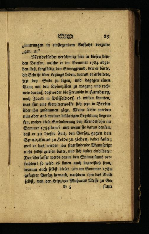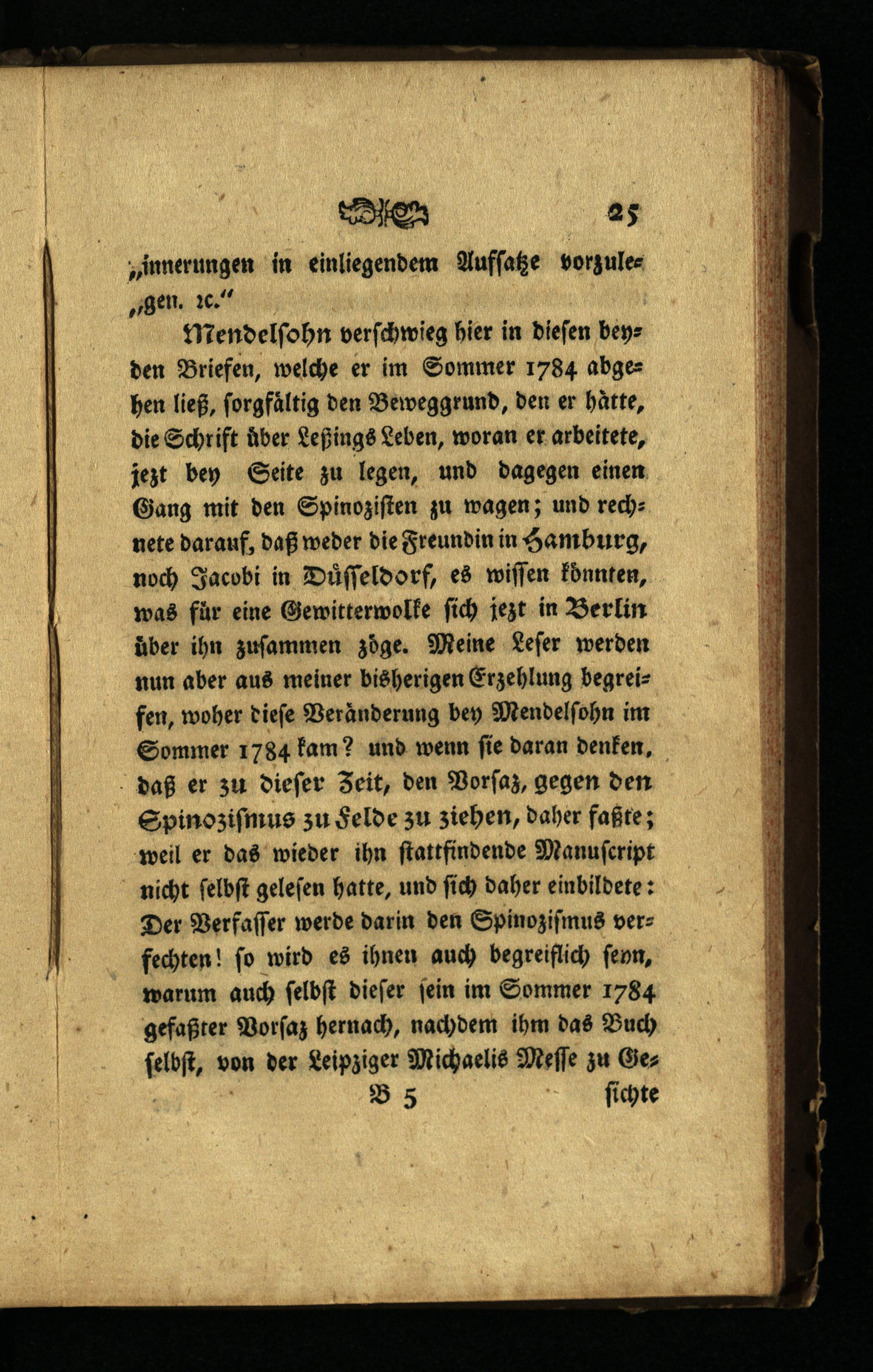 Mendelſohn verſchwieg hier in dieſen beyden Briefen, welche er im Sommer 1784 abgehen ließ, ſorgfaͤltig den Beweggrund, den er hätte, die Schrift uͤber Leßings Leben, woran er arbeitete, jezt bey Seite zu legen, und dagegen einen Gang mit den Spinoziſten zu wagen; und rechnete darauf, daß weder die Freundin in Hamburg, noch Jacobi in Duͤſſeldorf, es wiſſen Könnten, was für eine Gewitterwolke ſich jezt in Berlin über ihn zuſammen zoͤge. Meine Leſer werden nun aber aus meiner bisherigen Erzehlung begreifen, woher dieſe Veränderung bey Mendelſohn im Sommer 1784 kam? und wenn fie daran denken, daß er zu dieſer Zeit, den Vorſaz, gegen den Spinoʒiſmus zu Felde zu ziehen, daher faßte; weil er das wieder ihn ſtattfindende Manuſcript nicht ſelbſt geleſen hatte, und ſich daher einbildete: Der Verfaſſer werde darin den Spinoziſmus verfechten! fo wird es ihnen auch begreiflich ſeyn, warum auch ſelbſt dieſer ſein im Sommer 1784 gefaßter Vorſaz hernach, nachdem ihm das Buch ſelbſt, von der Leipziger Michaelis Meſſe zu Ge