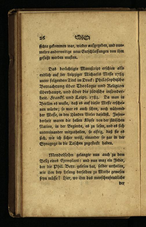 Das bernchtigte Manuſcript erſchien alſo endlich auf der Leipziger Michaelis Meſſe 1784 unter folgendem Titel im Druck: Philoſophiſche Betrachtung über Theologie und Religion überhaupt, und über die juͤdiſche inſonderheit. Frankf. und Leipz. 1783. Da man in Berlin es wuſte, daß es auf dieſer Meſſe erſcheinen wurde; fo war es auch ſchon, noch während der Meſſe, in den Handen Vieler daſelbſt. Inſonderheit waren die hellen Köpfe von der juͤdiſchen Nation, in der Begierde, es zu leſen, und es ſich untereinander mitzutheilen, ſo eifrig, daß ſie es ſich, wie ich ſicher weiß, einander ſo gar in der Synagoge in die Taſchen zugeſteckt haben.
