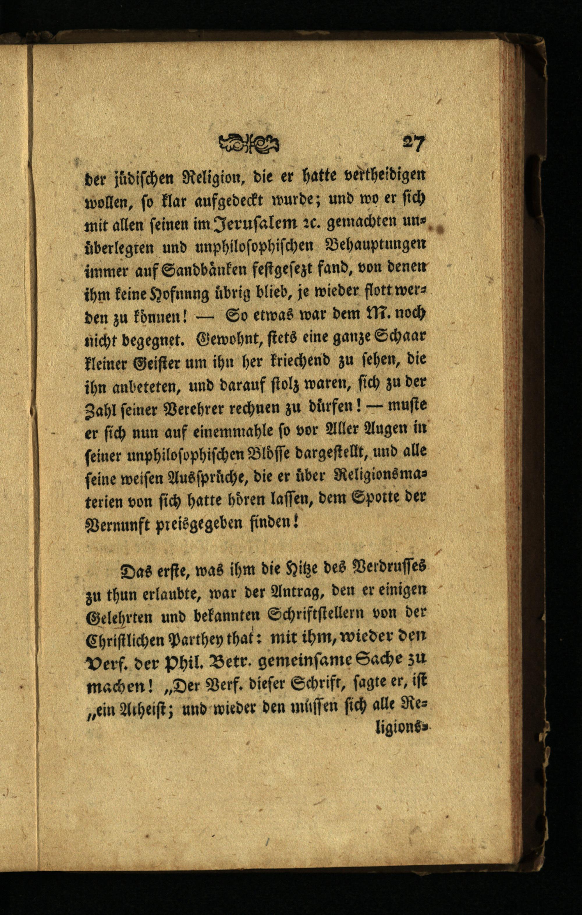 Das erſte, was ihm die Hitze des Verdruſſes zu thun erlaubte, war der Antrag, den er einigen Gelehrten und bekannten Schriftſtellern von der Chriſtlichen Parthey that: mit ihm, wieder den Verf. der Phil. Betr. gemeinſame Sache zu machen!„Der Verf. dieſer Schrift, ſagte er, iſt „ein Aiheiſt; und wieder den müſſen ſich alle Re