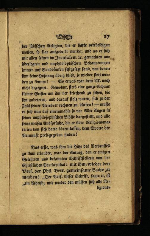 der juͤdiſchen Religion, die er hatte vertheidigen wollen, ſo klar aufgedeckt wurde; und wo er ſich mit allen(einen im Jeruſalem 2c. gemachten uns, üuͤberlegten und unphiloſophiſchen Behauptungen j immer auf Sandbaͤnken feſtgeſezt fand, von denen ihm keine Hofnnng übrig blieb, je wieder flott werden zu konnen!— So etwas war dem M. noch nicht begegnet. Gewohnt, ſtets eine ganze Schaar kleiner Geiſter um ihn her kriechend zu ſehen, die ihn aubeteten, und darauf ſtolz waren, ſich zu der Zahl ſeiner Verehrer rechnen zu durfen!— muſte er ſich nun auf einemmahle ſo vor Aller Augen in feiner unphiloſophiſchen Blöſſe dargeſtellt, und alle feine weiſen Ausſprůche, die er uber Religions materien von ſich hatte hören laſſen, dem Spotte der Vernunft preisgegeben finden