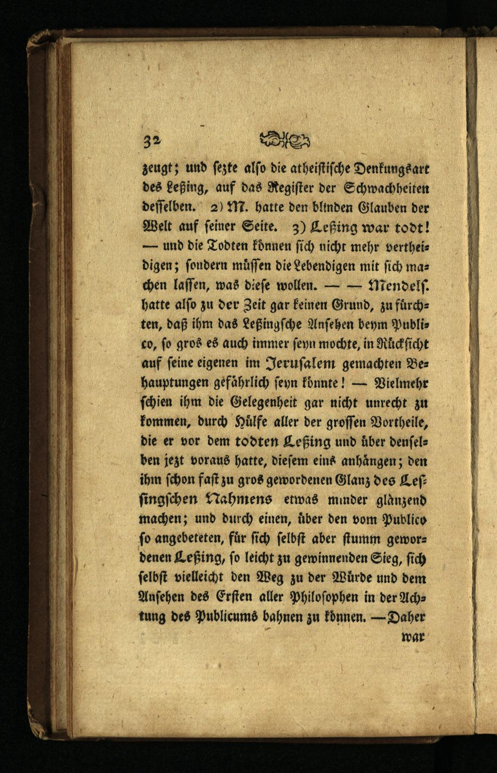 32 DC zeugt; und fezte alfo die atheiftifche Denkungsart des Leßing, auf das Regiſter der Schwachheiten deſſelben. 2) M. hatte den blinden Glauben der Welt auf ſeiner Seite. 3) Leßing war todt! — und die Todten koͤnnen ſich nicht mehr vertheidigen; ſondern muſſen die Lebendigen mit ſich mas chen laſſen, was dieſe wollen.—— Mendelſ. hatte alſo zu der Zeit gar keinen Grund, zu fuͤrchten, daß ihm das Leßingſche Anſehen beym Publico, fo gros es auch immer ſeyn mochte, in Ruͤckſicht auf ſeine eigenen im Jeruſalem gemachten Behauptungen gefährlich ſeyn Konnte!— Vielmehr ſchien ihm die Gelegenheit gar nicht unrecht zu kommen, durch Huͤlfe aller der groſſen Vortheile, die er vor dem todten Leßing und über denſelben jezt voraus hatte, dieſem eins anhaͤngen; den ihm ſchon faſt zu gros gewordenen Glanz des Leſſingſchen Nahmens etwas minder glänzend machen; und durch einen, über den vom Publico fo angebeteten, für ſich ſelbſt aber ſtumm gewordenen Leßing, fo leicht zu gewinnenden Sieg, ſich ſelbſt vielleicht den Weg zu der Würde und dem Anſehen des Erſten aller Philoſophen in der Achtung des Publicums bahnen zu koͤnnen.— Daher war