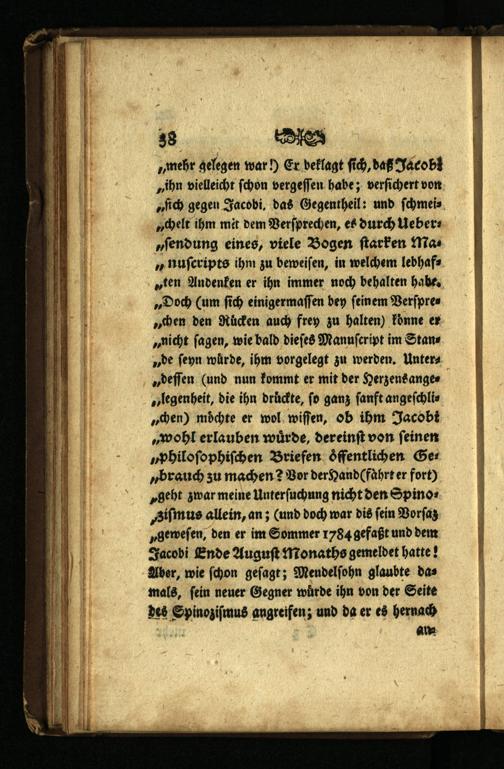 „chen) möchte er wol wiſſen, ob ihm Jacobi „wohl erlauben wuͤrde, dereinſt von ſeinen „philoſophiſchen Briefen offentlichen Ser „brauch zu machen? Vor der Handl fahrt er fort) „geht zwar meine Unterſuchung nicht den SpinoKSiſmus allein, an;(und doch war dis fein Vorſaz „geweſen, den er im Sommer 1784 gefaßt und dem Jacobi Ende Auguſt Monaths gemeldet hatte! Aber, wie ſchon geſagt; Mendelſohn glaubte damals, ſein neuer Gegner wurde ihn von der Seite