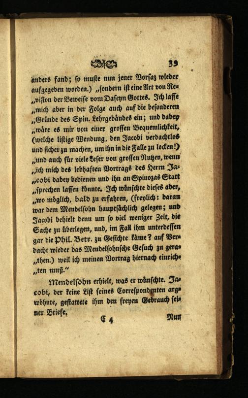 CA 39 anders fand; fo muſte nun jener Vorſaz wieder aufgegeben worden.)„ſondern iſt eine Art von Re„viſion der Beweiſe vom Daſeyn Gottes. Ich laſſe „mich aber in der Folge auch auf die beſonderen „Grunde des Spin. Lehrgebäudes ein; und dabey „waͤre es mir von einer groſſen Bequemlichkeit, (welche liſtige Wendung. den Jacobi verdachtlos und ſicher zu machen, um ihn in die Falle zu locken) und auch für viele Leſer von groſſen Nutzen, wenn „ich mich des lebhaften Vortrags des Herrn Ja„cobi dabey bedienen und ihn an Spinoʒas Statt „ſprechen laſſen konnte. Ich wunſchte dieſes aber, „wo möglich, bald zu erfahren,(freylich: daran war dem Mendelſohn hauptſaͤchlich gelegen; und Jacobi behielt denn um ſo viel weniger Zeit, die Sache zu überlegen, und, im Fall ihm unterdeſſen gar die Phil. Betr. zu Geſichte kame 7 auf Verdacht wieder das Mendelſohnſche Geſuch zu gerathen) weil ich meinen Vortrag hiernach einrich„ten muß.“