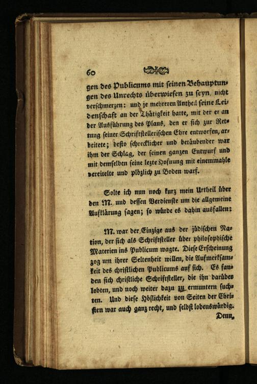 . war der Einzige aus der judiſchen Nation, der ſich als Schriftſteller lber philoſophiſche Materien ins Publicum wagte. Dieſe Erſcheinung zog um ihrer Seltenheit willen, die Aufmerkſamkeit des chriſtlichen Publicums auf ſich. Es fanden ſich chriſtliche Schriftſteller, die ihn daruber lobten, und noch weiter dazu zu ermuntern ſuchten. Und dieſe Höflichkeit von Seiten der Chriſten war auch ganz recht, und ſelbſt lobens würdig. Denn.