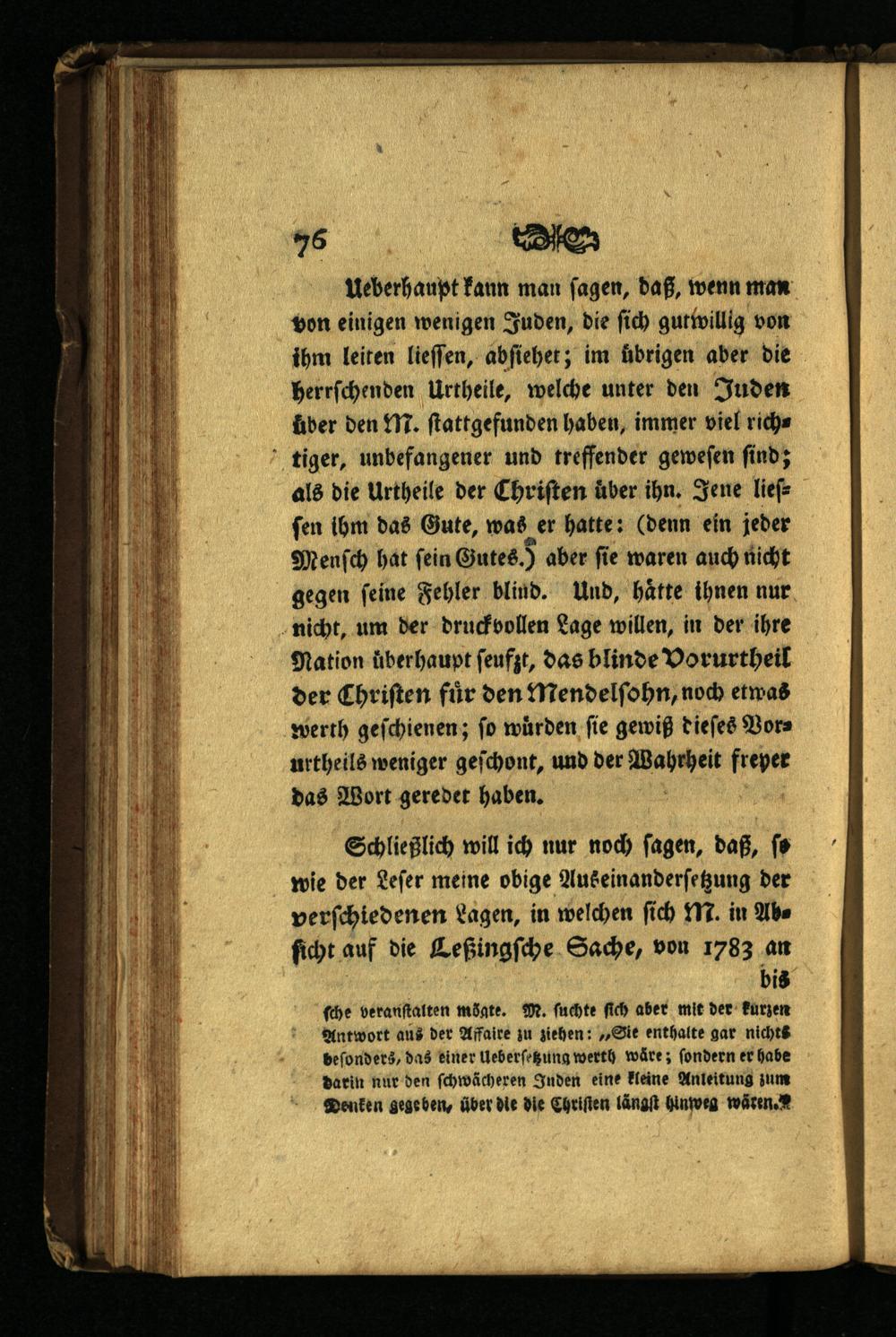Ueberhaupt kann man ſagen, daß, wenn man von einigen wenigen Juden, die ſich gutwillig von ihm leiten lieſſen, abſiehet; im übrigen aber die herrſchenden Urtheile, welche unter den Juden über den M. ſtattgefunden haben, immer viel richtiger, unbefangener und treffender geweſen ſind; als die Urtheile der Chriſten uͤber ihn. Jene lieſſen ihm das Gute, was er hatte:(denn ein jeder Menſch hat ſein Gutes ʒ aber ſie waren auch nicht gegen feine Fehler blind. Und, hätte ihnen nur nicht, um der druckvollen Lage willen, in der ihre Nation überhaupt ſeufzt, das blinde Vorurtheil