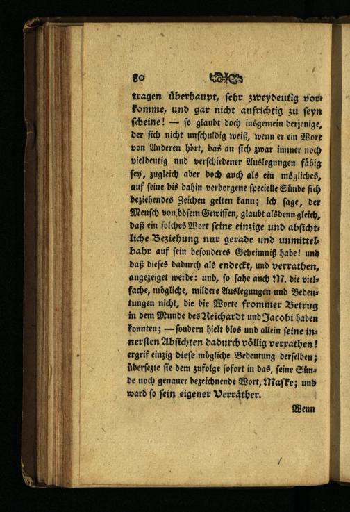 80. tragen Überhaupt, ſehr zweydeutig vor komme, und gar nicht aufrichtig zu ſeyn ſcheine!— ſo glaubt doch insgemein derjenige,| der ſich nicht unſchuldig weiß, wenn er ein Wort| von Anderen hoͤrt, das an ſich zwar immer noch vieldeutig und verſchiedener Auslegungen fähig ſey, zugleich aber doch auch als ein moͤgliches, auf feine bis dahin verborgene ſpecielle Suͤnde ſich beziehendes Zeichen gelten kann; ich ſage, der Menſch von bdſem Gewiſſen, glaubt als denn gleich, daß ein ſolches Wort feine einzige und abſichtliche Beziehung nur gerade und unmittelbahr auf ſein beſonderes Geheimniß habe! und daß dieſes dadurch als endeckt, und verrathen, angezeiget werde: und, fo ſahe auch NT, die vielfache, mögliche, mildere Auslegungen und Bedeutungen nicht, die die Worte frommer Betrug in dem Munde des Reichardt und Jacobi haben konnten;— ſondern hielt blos und allein ſeine innerſten Abſichten dadurch völlig verrathen/ ergrif einzig dieſe mögliche Bedeutung derſelben z uͤberſezte fie dem zufolge ſofort in das, feine Sünde noch genauer bezeichnende Wort, Maſke; und ward ſo ſein eigener Verraͤther.