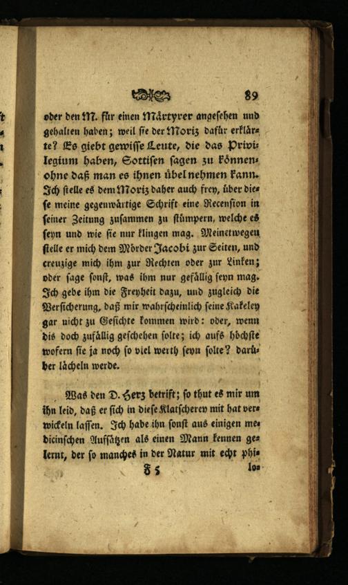 oder den M. für einen Maͤrtyrer angeſehen und gehalten haben; weil fie der Moriz dafür erklaͤrte? Es giebt gewiſſe Leute, die das Privilegium haben, Sottiſen ſagen zu koöͤnnenohne daß man es ihnen uͤbel nehmen kann. Ich ſtelle es dem Moriz daher auch frey, uͤber dies fe meine gegenwärtige Schrift eine Recenſion in