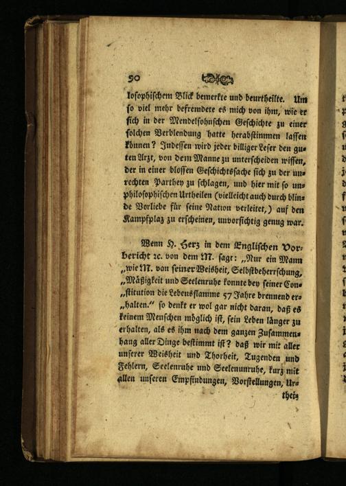 390 Des loſophiſchem Blick bemerkte und beurkheilte. Um ſo viel mehr befremdete es mich von ihm, wie er ſich in der Mendelſohnſchen Geſchichte zu einer ſolchen Verblendung hatte herabſtimmen laſſen koͤnen? Indeſſen wird jeder billiger Leſer den guten Arzt, von dem Manne zu unterſcheiden wiſſen, der in einer bloſſen Geſchichtsſache ſich zu der uns rechten Parthey zu ſchlagen, und hier mit ſo unphiloſophiſchen Urtheilen(vielleicht auch durch blinde Vorliebe für feine Nation verleitet,) auf den Kampfplaz zu erſcheinen, unvorſichtig genug war.