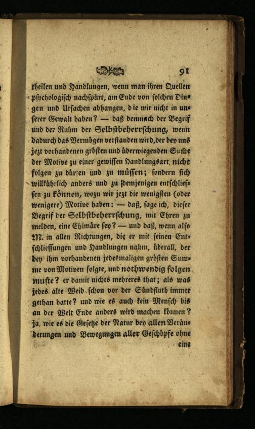 Des 91 theilen und Handlungen, wenn man ihren Quellen pſhehologiſch nachſpurt, am Ende von ſolchen Dingen und Urſachen abhangen, die wir nicht in uns ſerer Gewalt haben?— daß demnach der Begrif und der Ruhm der Selbſtbeherrſchung, wenn dadurch das Vermoͤgen verſtanden wird, der bey uns jezt vorhandenen grbſten und uͤberwiegenden Sum̃e deer Motive zu einer gewiſſen Handlungsart nicht folgen zu daͤrfen und zu muͤſſen; ſondern ſich = willkährlich anders und zu demjenigen entſchlieſfen zu konnen, wozu wir jezt die wenigſten(oder wenigere) Motive haben:— daß, ſage ich, dieſer Begrif der Selbſtbeherrſchung, mit Ehren zu melden, eine Chimaͤre ſey?— und daß, wenn alſo M. in allen Richtungen, die er mit ſeinen Entſchlieſſungen und Handlungen nahm, uberall, der bey ihm vorhandenen jedes maligen groͤſten Summe von Motiven folgte, und nothwendig folgen muſte? er damit nichts mehreres that; als was jedes alte Weib ſchon vor der Sundfluth immer gethan hatte? und wie es auch kein Menſch bis an der Welt Ende anders wird machen koͤnnen? ja, wie es die Geſetze der Natur bey allen Veranderungen und Bewegungen aller Geſchöͤpfe ohne eine