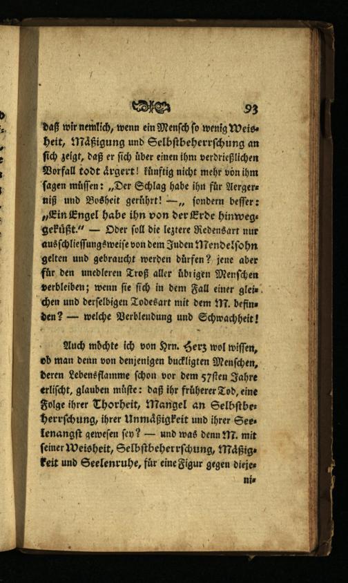 A) 93 daß wir nemlich, wenn ein Menfch fo wenig Weis heit, Maãßigung und Selbſtbeherrſchung an ſich zeigt, daß er ſich über einen ihm verdrießlichen Vorfall todt aͤrgert! kuͤnftig nicht mehr von ihm ſagen muͤſſen:„Der Schlag hahe ihn für Aerger= niß und Bosheit gerührt!—, ſondern beſſer: »Ein Engel habe ihn von der Erde hinweggekuͤßt.“— Oder ſoll die leztere Redensart nur ausſchlieſſungsweiſe von dem Juden Mendelſohn gelten und gebraucht werden dürfen?, jene aber fſur den unedleren Troß aller übrigen Menſchen verbleiben; wenn fie ſich in dem Fall einer gleichen und derſelbigen Todesart mit dem M. befinden?— welche Verblendung und Schwachheit!