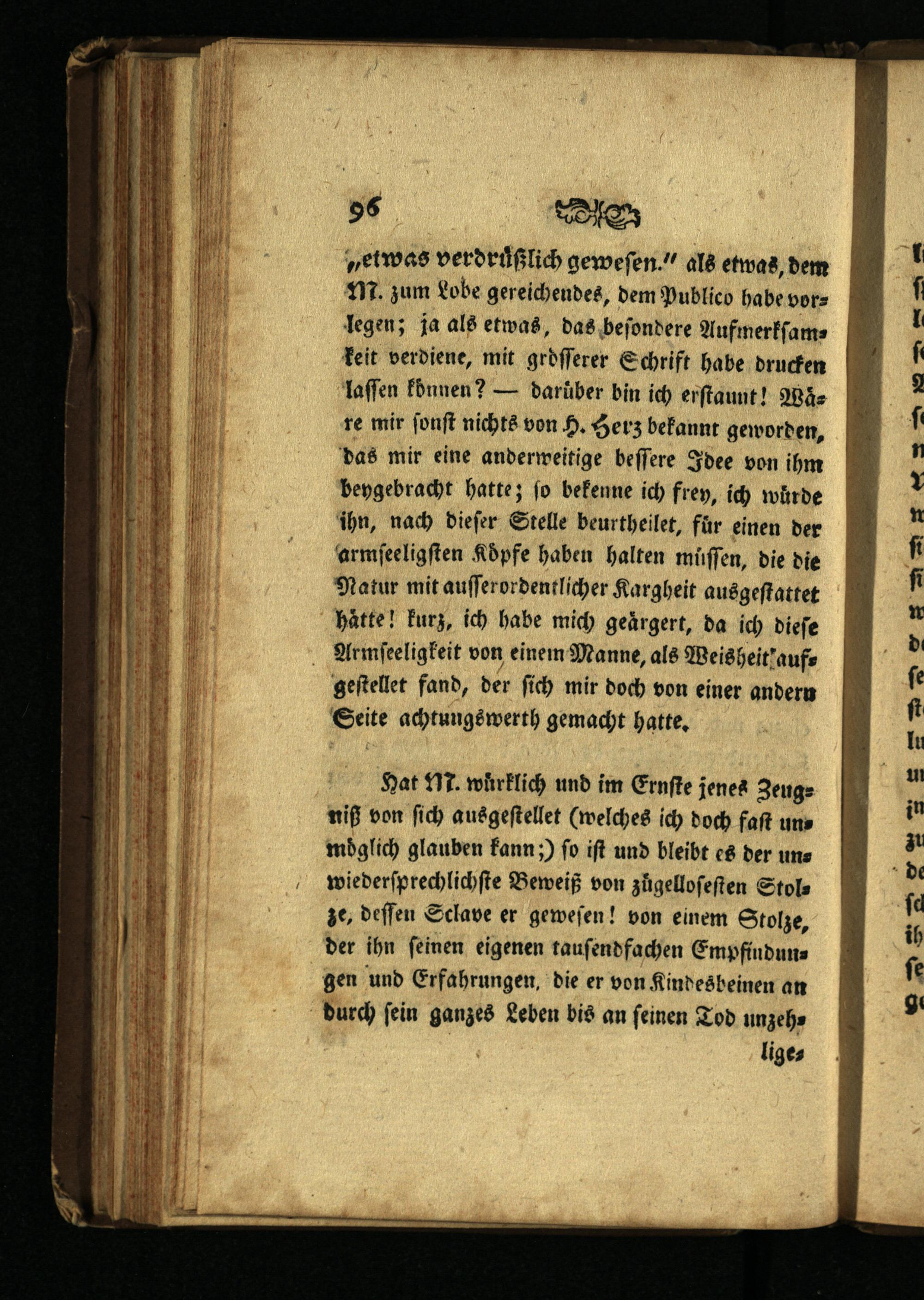legen; ja als etwas, das beſondere Aufmerkſamkeit verdiene, mit groͤſſerer Schrift habe drucken laſſen könen?— darüber bin ich erſtaunt! Ware mir ſonſt nichts von H. Herz bekannt geworden, das mir eine anderweitige beſſere Idee von ihm beygebracht hatte; ſo bekenne ich frey, ich wurde ihn, nach dieſer Stelle beurtheilet, fuͤr einen der armſeeligſten Köpfe haben halten müſſen, die die Natur mit auſſerordentlicher Kargheit ausgeſtattet hätte! kurz, ich habe mich geärgert, da ich dieſe Armſeeligkeit von einem Manne, als Weis heit aufgeſtellet fand, der ſich mir doch von einer andern Seite achtungswerth gemacht hatte.
