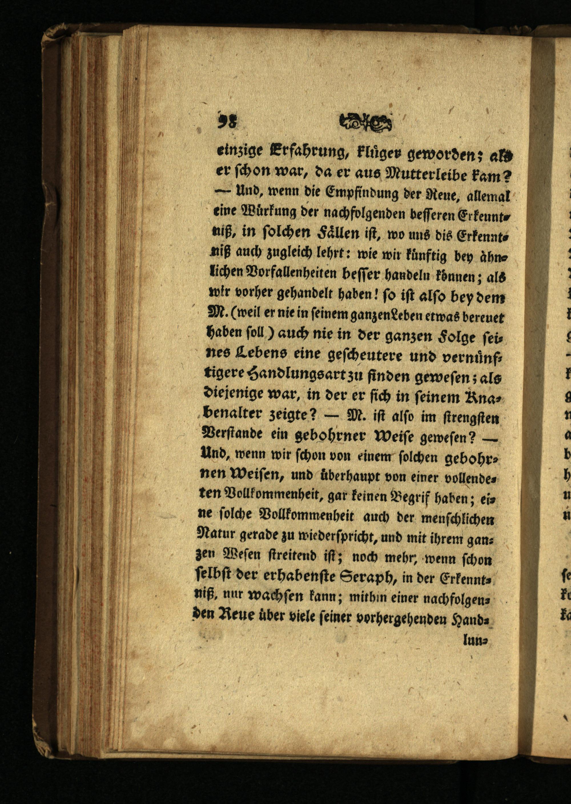 58 CE einzige Erfahrung, Flıger geworden; als er ſchon war, da er aus Mutterleibe kam? — Und, wenn die Empfindung der Neue, allemal eine Wirkung der nachfolgenden beſſeren Erkeuntniß, in ſolchen Faͤllen iſt, wo uns dis Erkenntniß auch zugleich lehrt: wie wir kuͤnftig bey ähne lichen Vorfallenheiten heſſer handeln können; als wir vorher gehandelt haben! ſo iſt alſo bey dem M.(weil er nie in feinem ganzen Leben etwas bereuet haben ſoll) auch nie in der ganzen Folge ſeines Lebens eine geſcheutere und vernuͤnftigere Handlungsart zu finden geweſen; als diejenige war, in der er ſich in feinem Rnas benalter zeigte?— M. iſt alſo im ſtrengſten Verſtande ein gebohrner Weiſe geweſen?— Und, wenn wir ſchon von einem ſolchen gebohrnen Weiſen, und uberhaupt von einer vollendeten Vollkommenheit, gar keinen Begrif haben; eine ſolche Vollkommenheit auch der menſchlichen Natur gerade zu wiederſpricht, und mit ihrem ganz zen Weſen ſtreitend iſt; noch mehr, wenn ſchon ſelbſt der erhabenſte Seraph, in der Erkenntniß, nur wachſen kann; mithin einer nachfolgen