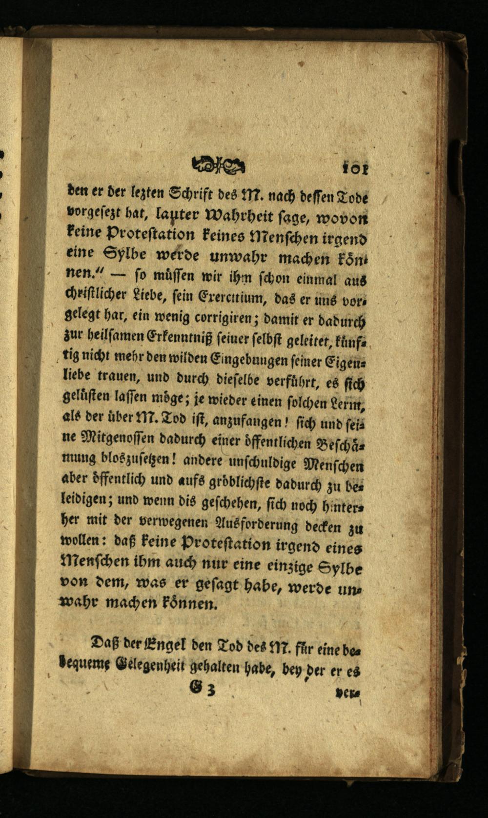 liebe trauen, und durch dieſelbe verführt, es ſich gelüſten laſſen möge; je wieder einen ſolchen Lernt, als der über M. Tod iſt, anzufangen/ ſich und ſeine Mitgenoſſen dadurch einer öffentlichen Beſchaͤmung bloszuſetzen! andere unſchuldige Menſchen aber Öffentlich und aufs gröͤblichſte dadurch zu beleidigen; und wenn dis geſchehen, ſich noch hinterher mit der verwegenen Ausforderung decken zu wollen: daß keine Proteſtation irgend eines Menſchen ihm auch nur eine einzige Sylbe von dem, was er geſagt habe, werde unwahr machen konnen.