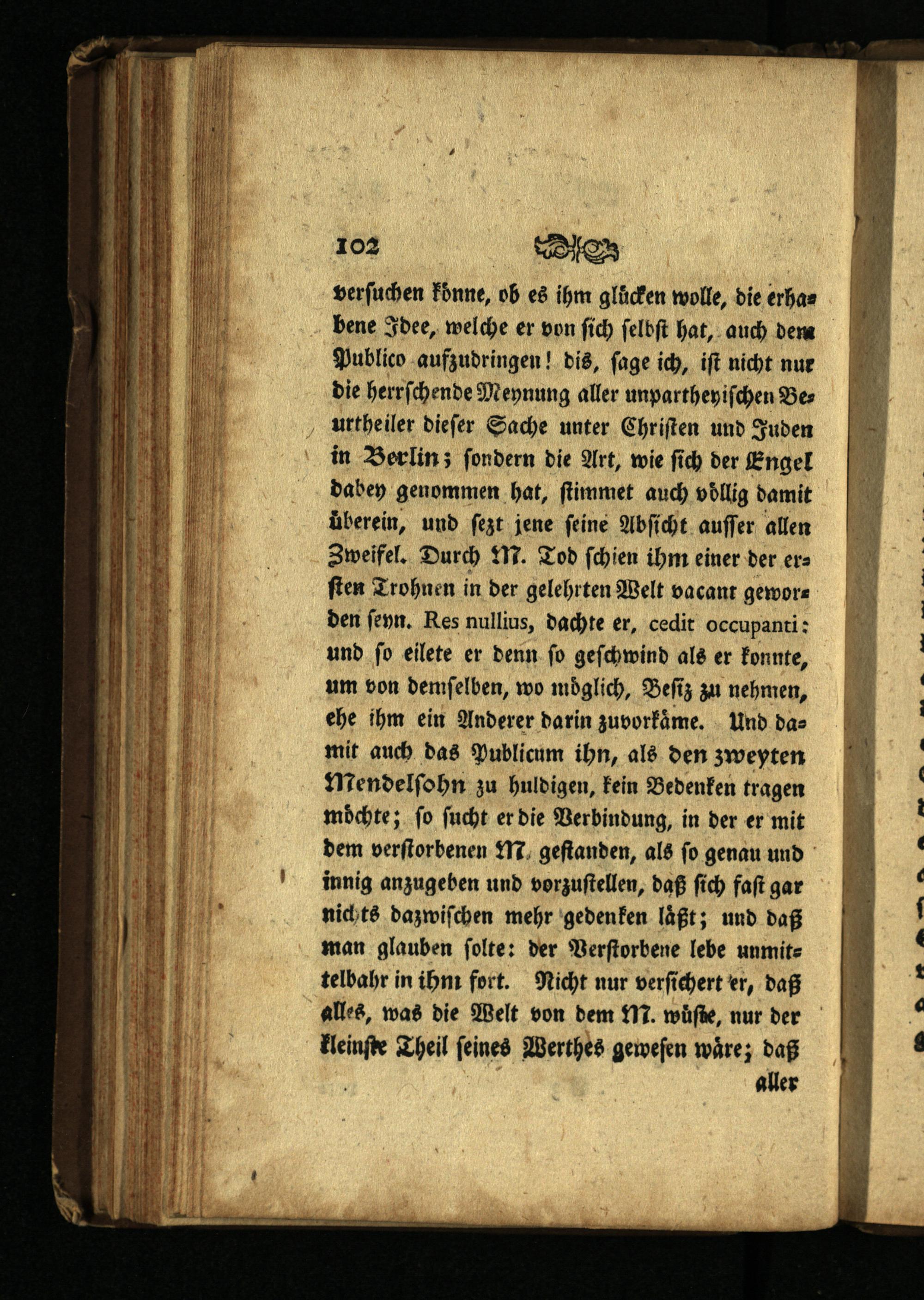verſuchen koͤnne, ob es ihm glücken wolle, die erhabene Idee, welche er von ſich ſelbſt hat, auch dem Publico aufzudringen! dis, ſage ich, iſt nicht nur die herrſchende Meynung aller unpartheyiſchen Beurtheiler dieſer Sache unter Chriſten und Juden in Berlin; ſondern die Art, wie ſich der Engel dabey genommen hat, ſtimmet auch völlig damit überein, und ſezt jene feine Abſicht auſſer allen Zweifel. Durch M. Tod ſchien ihm einer der erſten Trohnen in der gelehrten Welt vacant geworden ſeyn. Res nullius, dachte er, cedit occupanti: und ſo eilete er denn ſo geſchwind als er konnte, um von demſelben, wo möglich, Beſiz zu nehmen, ehe ihm ein Anderer darin zuvorkaͤme. Und das mit auch das Publicum ihn, als den zweyten Mendelſohn zu huldigen, kein Bedenken tragen möchte; fo ſucht er die Verbindung, in der er mit dem verſtorbenen M. geſtanden, als fo genau und innig anzugeben und vorzuſtellen, daß ſich faſt gar nichts dazwiſchen mehr gedenken läßt; und daß man glauben ſolte: der Verſtorbene lebe unmittelbahr in ihm fort. Nicht nur verſichert er, daß alles, was die Welt von dem M. wuͤſte, nur der kleinſte Theil ſeines Werthes geweſen waͤre; daß