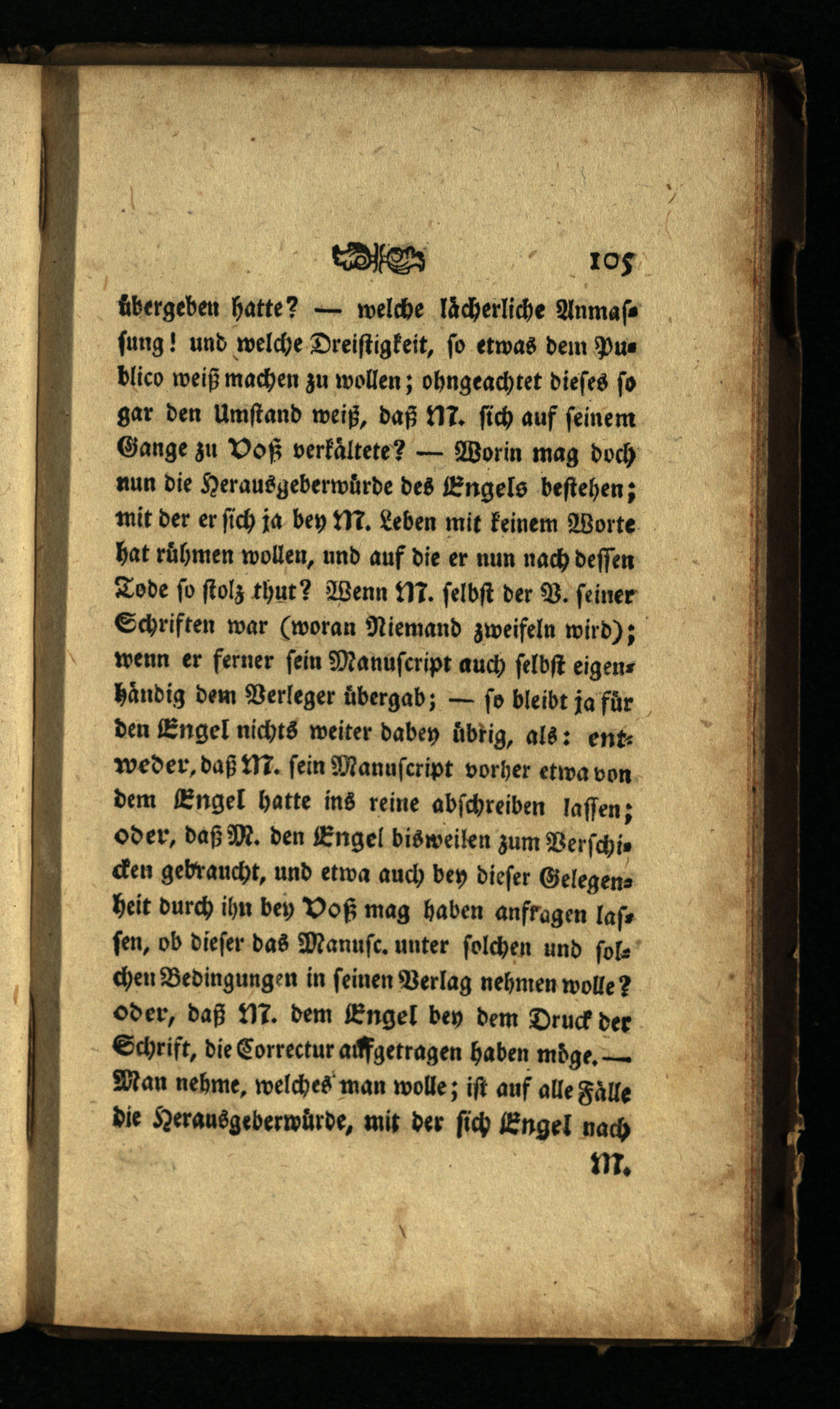 DS 105 übergeben hatte?— welche laͤcherliche Anmaſſung! und welche Dreiſtigkeit, ſo etwas dem Publico weiß machen zu wollen; ohngeachtet dieſes ſo gar den Umſtand weiß, daß M. ſich auf ſeinem Gange zu Voß verkaͤltete?— Worin mag doch nun die Herausgeberwurde des Engels beſtehen; mit der er ſich ja bey M. Leben mit keinem Worte hat ruͤhmen wollen, und auf die er nun nach deſſen Tode fo ſtolz thut? Wenn M. ſelbſt der V. ſeiner Schriften war(woran Niemand zweifeln wird); wenn er ferner fein Manuſcript auch ſelbſt eigenhaͤndig dem Verleger übergab;— fo bleibt ja für den Engel nichts weiter dabey übtig, als: ent: weder, daß M. fein Manuſcript vorher etwa von dem Engel hatte ins reine abſchreiben laſſen; oder, daß M. den Engel bisweilen zum Verſchicken gebraucht, und etwa auch bey dieſer Gelegenheit durch ihn bey Voß mag haben anfragen laſſen, ob dieſer das Manuſc. unter ſolchen und ſolchen Bedingungen in ſeinen Verlag nehmen wolle? oder, daß M. dem Engel bey dem Druck der Schrift, die Correctur aiffgetragen haben moͤge.— Man nehme, welches man wolle; iſt auf alle Faͤlle die Herausgeberwüurde, mit der ſich Engel nach