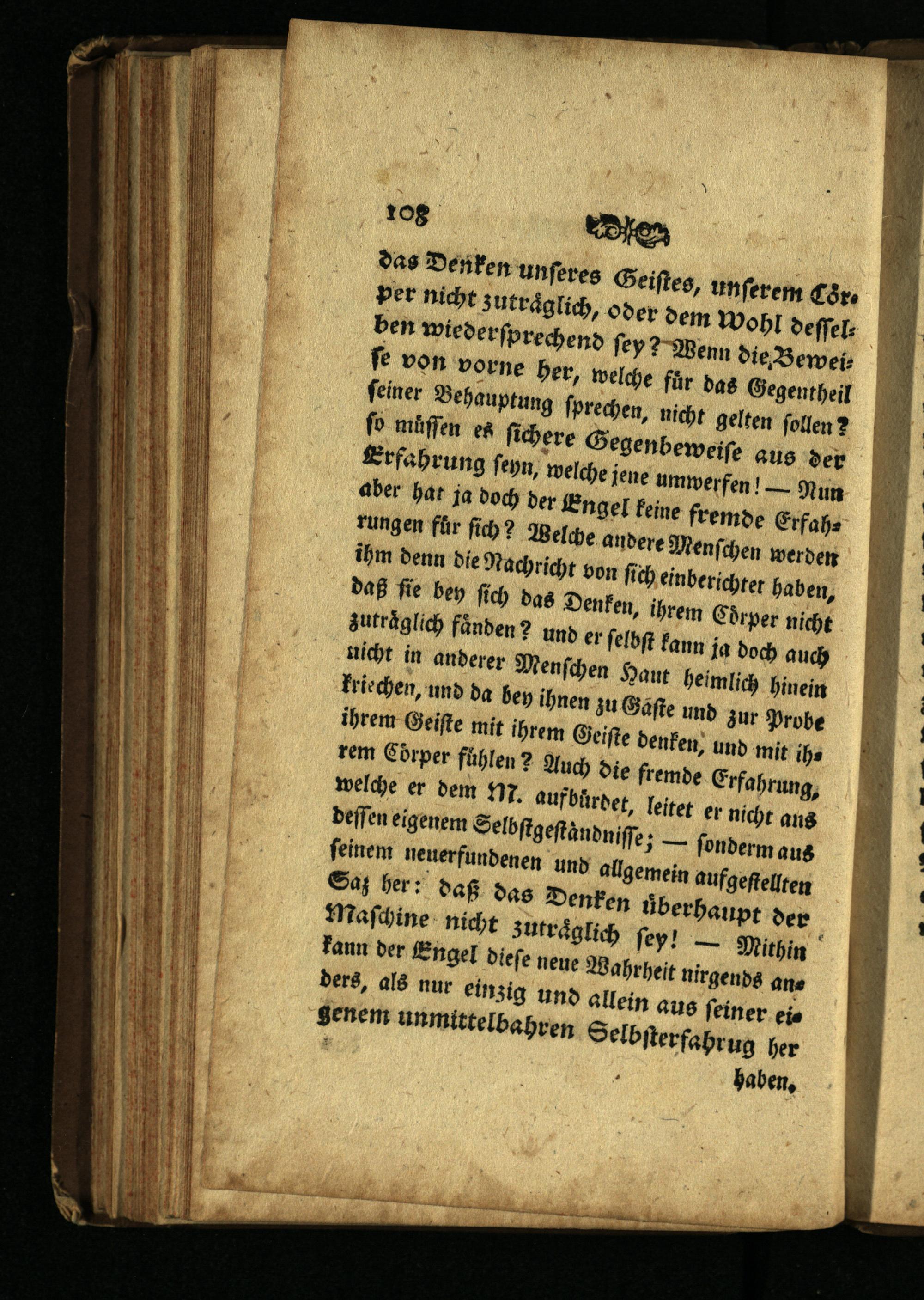 Maſchine nicht zutraͤglich ſey= Mithin kann der Engel dieſe neue Wahrheit nirgends anders, als nur einzig und allein aus ſeiner eigenem unmittelbahren Selbſterfahrug her ĩ haben.