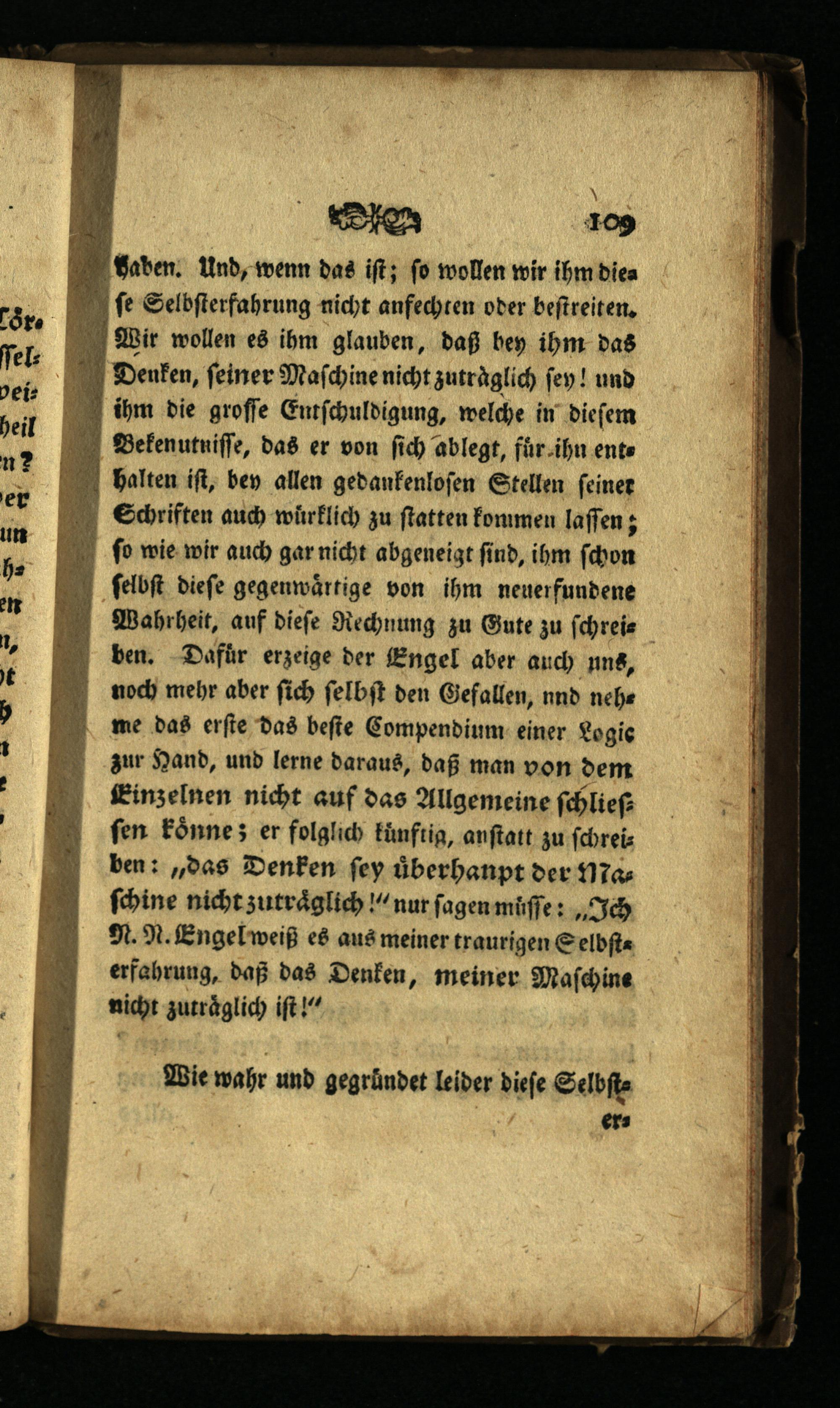 fen koͤnne; er folglich künftig, anſtatt zu ſchreiben:„das Denken ſey uͤberhanpt der MNa:ſchine nicht zutraͤglich!“ nur ſagen müſſe:„Ich N. N. Engel weiß es aus meiner traurigen Selbſt erfahrung, daß das Denken, meiner Maſchine nicht zutraͤglich iſt!“