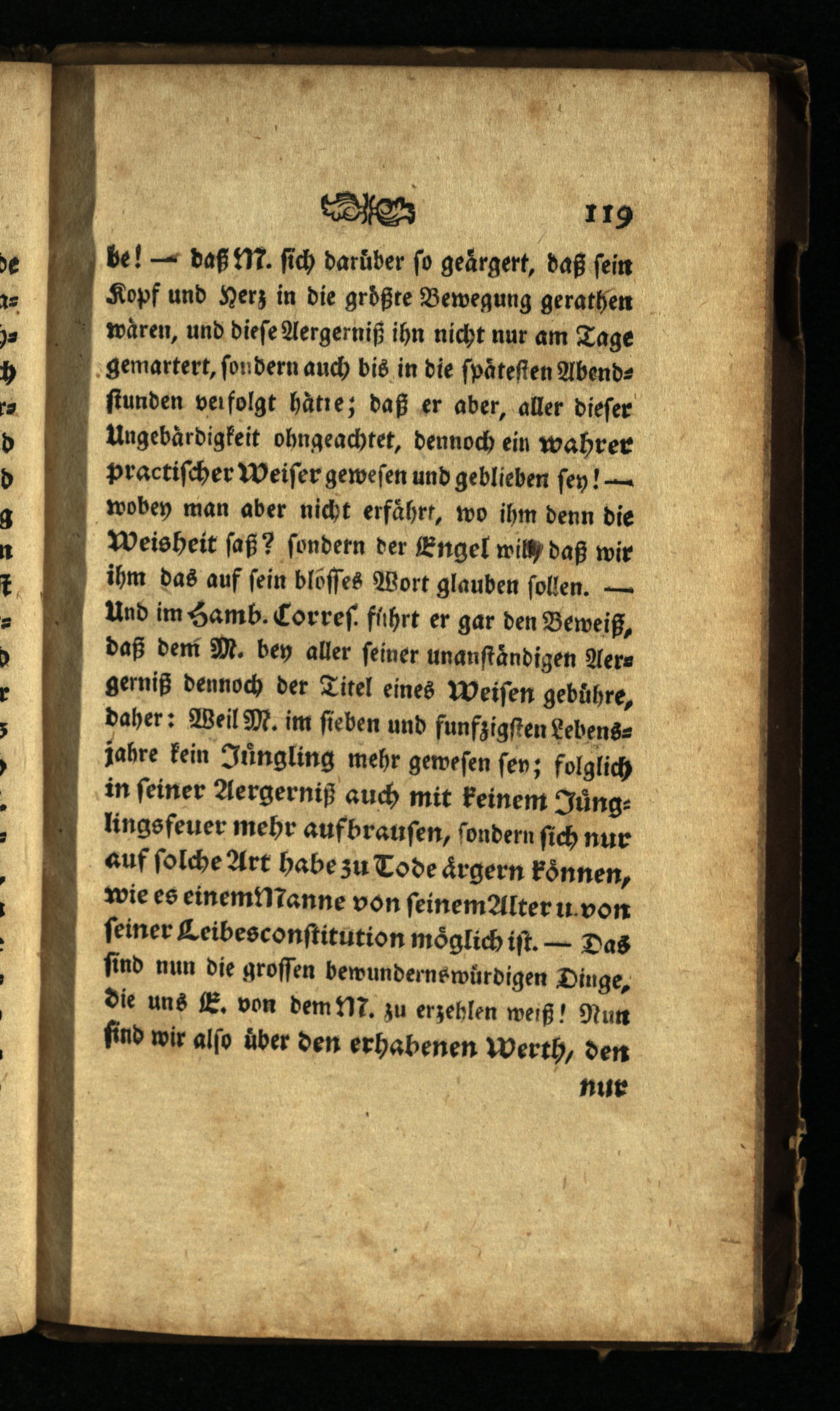 Und im Zamb. Correſ. führt er gar den Beweiß, daß dem M. bey aller ſeiner unanſtaͤndigen Aergerniß dennoch der Titel eines Weiſen gebuͤhre, daher: Weil M. im ſieben und funfzigſten Lebensjahre kein Jüngling mehr geweſen fen; folglich in ſeiner Aergerniß auch mit keinem Juͤnglingsfeuer mehr aufbrauſen, ſondern ſich nur auf ſolche Art habe zu Tode aͤrgern koͤnnen, wie es einem anne von ſeinem Alter u von feiner Ceibesconſtitution möglich iſt— Das ſind nun die groſſen bewundernswůrdigen Dinge, die uns E. von dem NT. zu erzehlen weiß Nun find wir alſo über den erhabenen Werth, den