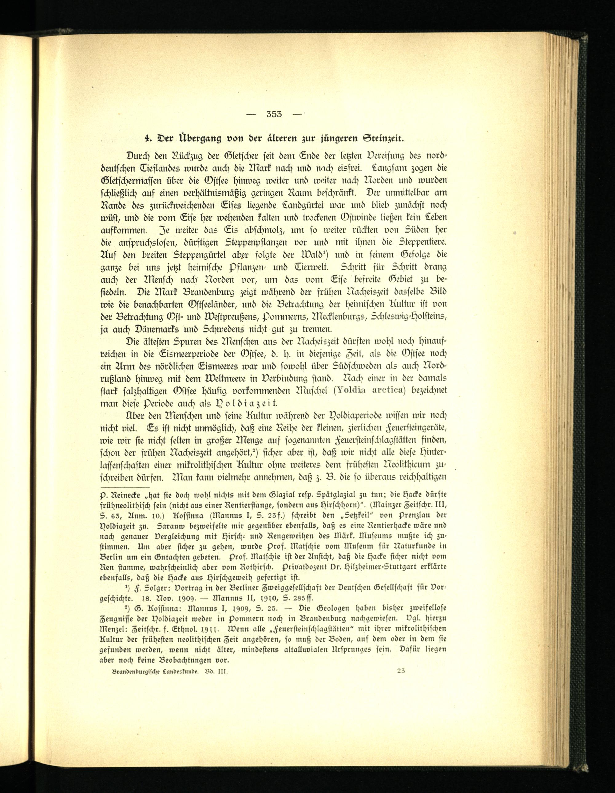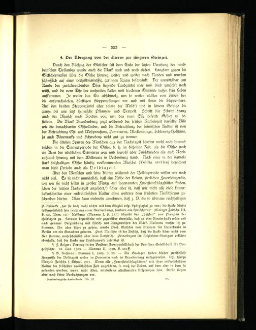2) G. Kossinna: Mannus I, (goy, S. 25. — Oie Geologen haben bisher zweifellose Zeugnisse der Holdiazeit weder in Pommern noch in Brandenburg nachgewiesen, vgl. hierzu Menzel: Zeitschr. f. Lthnol. igN- wenn alle „Feuersteiiischlagstätteu" mit ihrer mikrolithischen Kultur der frühesten neolithischen Zeit angehören, so muß der Boden, auf dem oder in dem sie gesunden werden, wenn nicht älter, mindestens altalluvialen Ursprunges sein. Dafür liegen aber noch keine Beobachtungen vor.