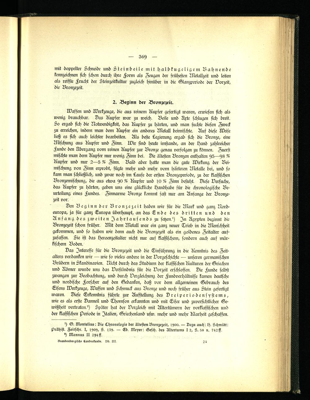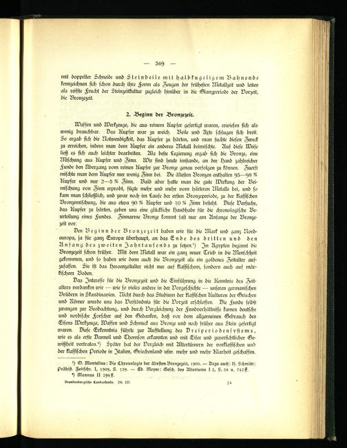 Den Beginn der Bronzezeit haben wir für die Mark und ganz Nordeuropa, ja für ganz Europa überhaupt, an das Ende des dritten und den Anfang des zweiten Jahrtausends zu setzen?) In Ägypten beginnt die Bronzezeit schon früher. Mit dem Metall war ein ganz neuer Trieb in die Menschheit gekommen, und so haben wir denn auch die Bronzezeit als ein goldenes Zeitalter aufzufassen. Sie ist das Heroenzeitalter nicht nur auf klassischem, sondern auch auf märkischem Boden.