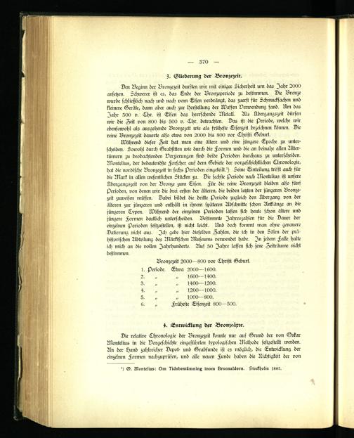 Die relative Ehronologie der Bronzezeit konnte nur auf Grund der von Gskar Montelius in die Vorgeschichte eingeführten typologischen Methode festgestellt werden. An der Hand zahlreicher Depot- und Grabfunde ist cs möglich, die Entwicklung der einzelnen Formen nachzuprüfen, und alle neuen Funde haben die Richtigkeit der von