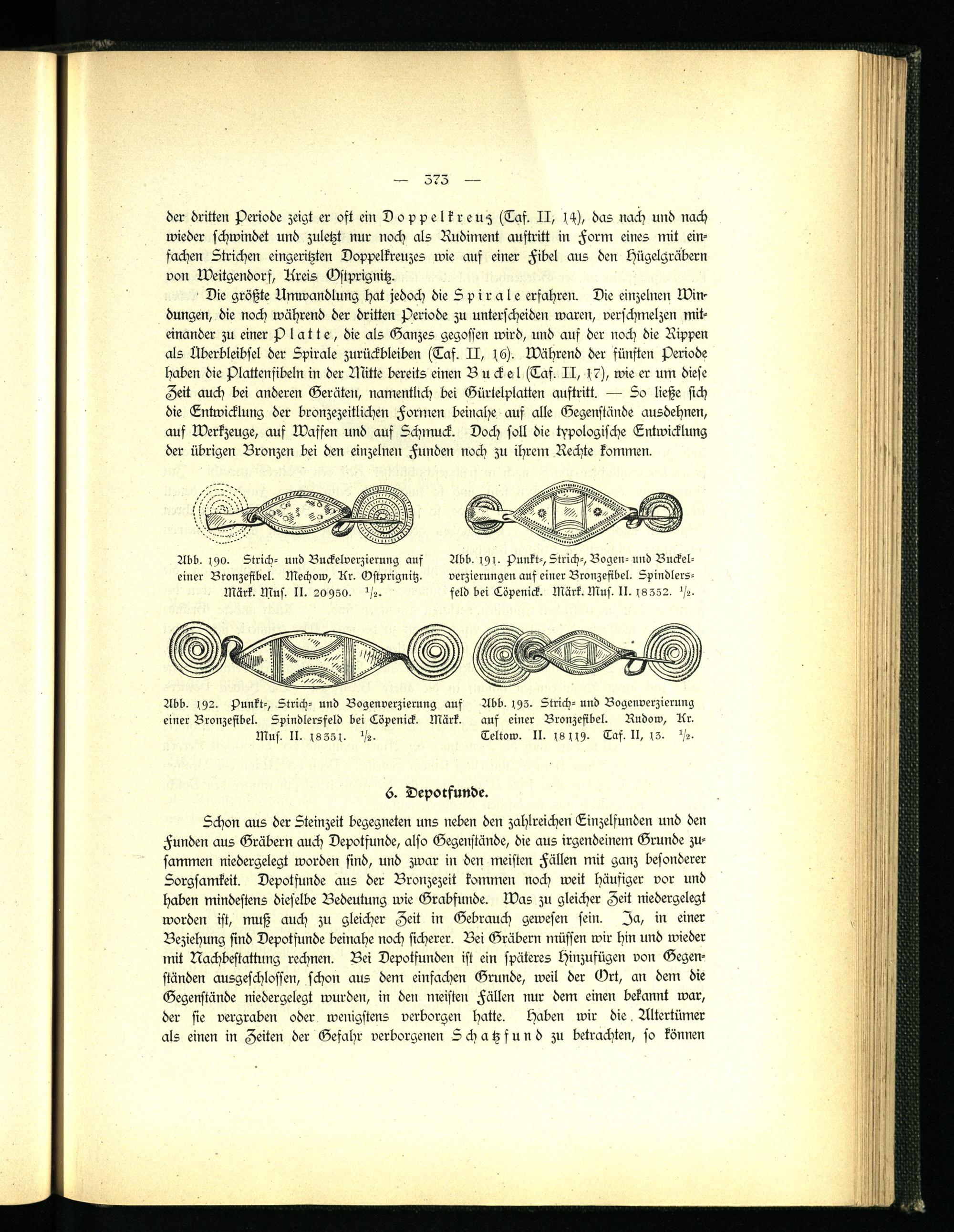 Abb. 192. Punkt-, Strich- und Bogenverzierung auf Abb. 19z. Strich- und Bogenverzierung einer Bronzefibel. Spindlersfeld bei Löxenick. Märk. auf einer Bronzefibel. Rudow, Ar.