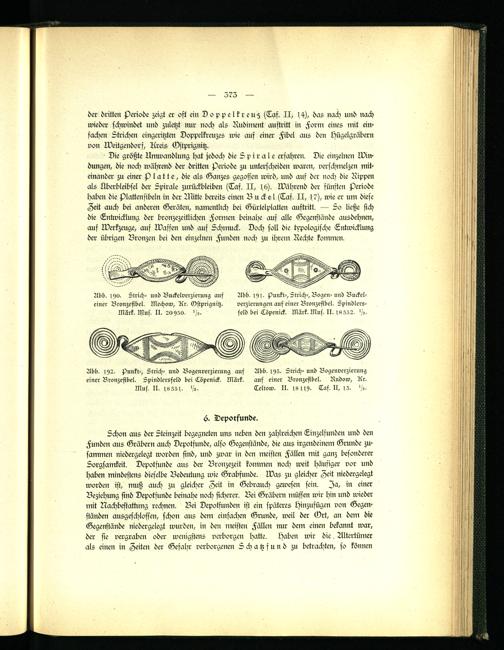 Die größte Umwandlung hat jedoch die Spirale erfahren. Die einzelnen Windungen, die noch während der dritten Periode zu unterscheiden waren, verschmelzen miteinander zu einer Platte, die als Ganzes gegossen wird, und auf der noch die Rippen als Überbleibsel der Spirale Zurückbleiben (Taf. II, sch. Während der fünften Periode haben die plattensibeln in der Witte bereits einen Buckel (Taf. II, I?), wie er um diese Zeit auch bei anderen Geräten, namentlich bei Gürtelplatten auftritt. — So ließe sich die Entwicklung der bronzezeitlichen Formen beinahe auf alle Gegenstände ausdehnen, auf Werkzeuge, auf Waffen und auf Schmuck. Doch soll die tvpologische Entwicklung der übrigen Bronzen bei den einzelnen Hunden noch zu ihrem Rechte kommen.