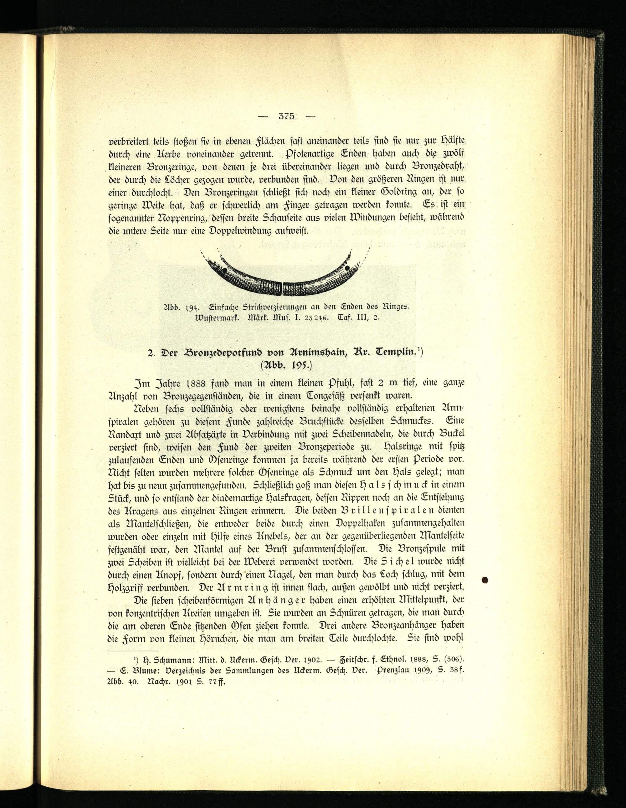 *) h. Schumann: Nitt. d. Uckerin. Gesch. Der. >>902. — Zeitschr. f. Lthnol. 1888, S. (506). — E. Blume: Verzeichnis der Sammlungen des Uckerm. Gesch. Der. prenzlau 1909, S. 58 f. Abb. -10. Nachr. 1901 S. 77ff.
