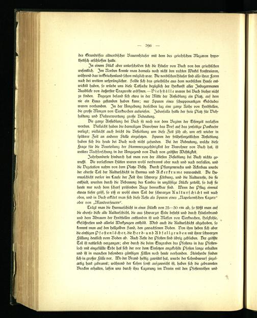 Jahrhunderte hindurch hat man von der ältesten Besiedlung bei Buch nichts gewußt. Die verlassenen Hütten waren wohl verbrannt oder nach und nach verfallen, und die Vegetation nahm von dem Platze Besitz. Durch Pflanzenwuchs und Ackerbau wurde der oberste Teil der Kulturschicht in Humus und Ackerkrume verwandelt. Die Humusschicht verlor im Laufe der Zeit ihre schwarze Färbung, und die Kulturreste, die sie enthielt, wurden durch die Bebauung des Landes in unzählige Stücke zerteilt, so daß sie heute nur noch dem scharf prüfenden Auge bemerkbar sind. Wenn der Pflug einmal etwas tiefer griff, so riß er wohl einen Teil der schwarzen Kulturschicht mit nach oben, und in Buch erklärt man sich diese Reste als Spuren eines „Napoleonischen Lagers" oder von „Manöverfeuern".