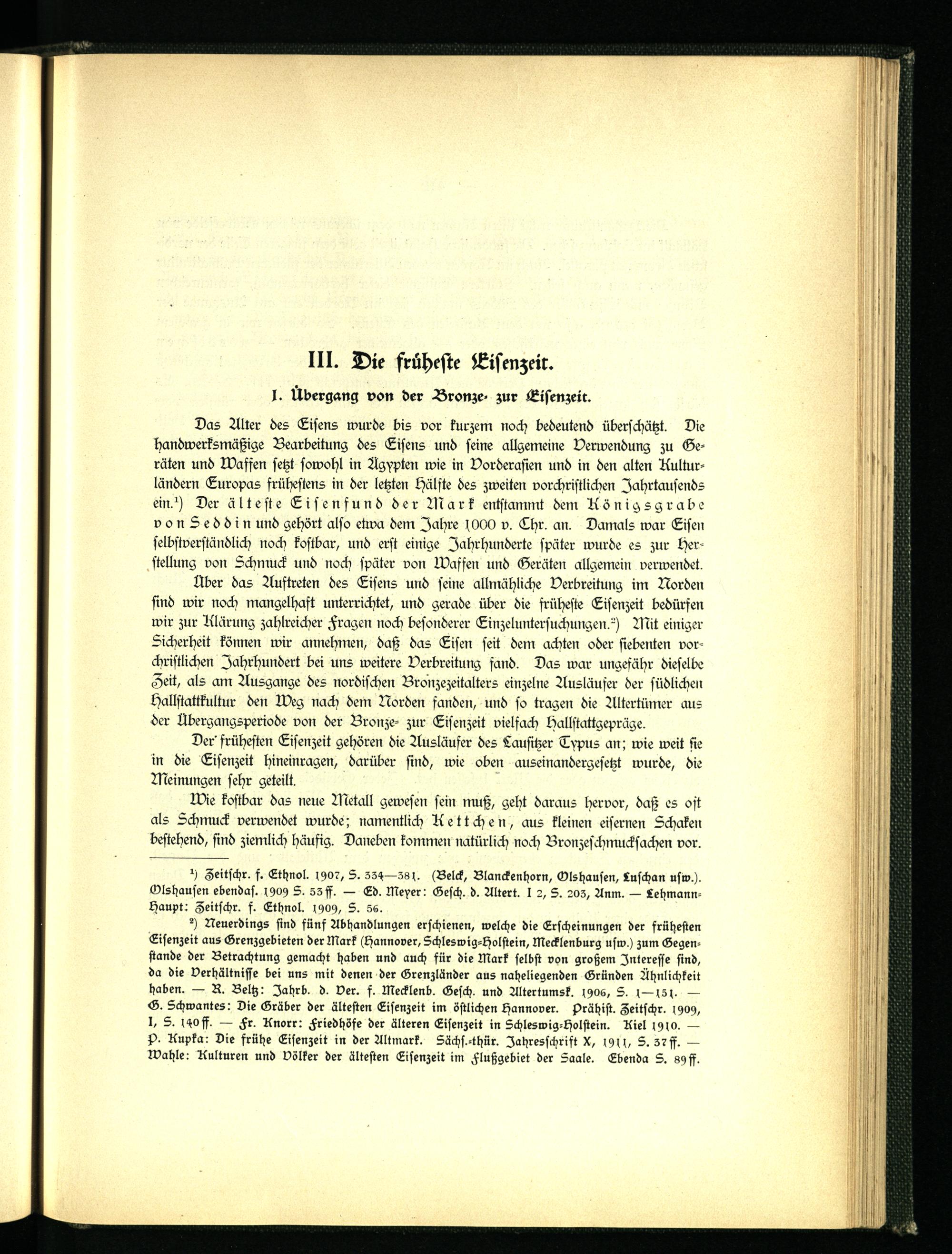 2) Neuerdings sind fünf Abhandlungen erschienen, welche die Erscheinungen der frühesten Eisenzeit aus Grenzgebieten der Mark (Hannover, Schleswig-Holstein, Mecklenburg usw.) zum Gegenstände der Betrachtung gemacht haben und auch für die Mark selbst von großem Interesse sind, da die Verhältnisse bei uns mit denen der Grenzländer aus naheliegenden Gründen Ähnlichkeit haben. — R. Beltz: Jahrb. d. ver. f. Mecklenb. Gesch. und Altertums?. 1906, S. 1—15p — G. Schmantes: Die Gräber der ältesten Eisenzeit im östlichen Hannover. Prähist. Zeitschr. 1909, I, S. 140 ff. — Fr. Knorr: Friedhöfe der älteren Eisenzeit in Schleswig-Holstein. Kiel 1910. — p- Kupka: Die frühe Eisenzeit in der Altmark. Sächs.-thür. Jahresschrift X, 1911, S. s? ff. — Wahle: Kulturen und Völker der ältesten Eisenzeit im Flußgebiet der Saale. Ebenda S. 89ff.
