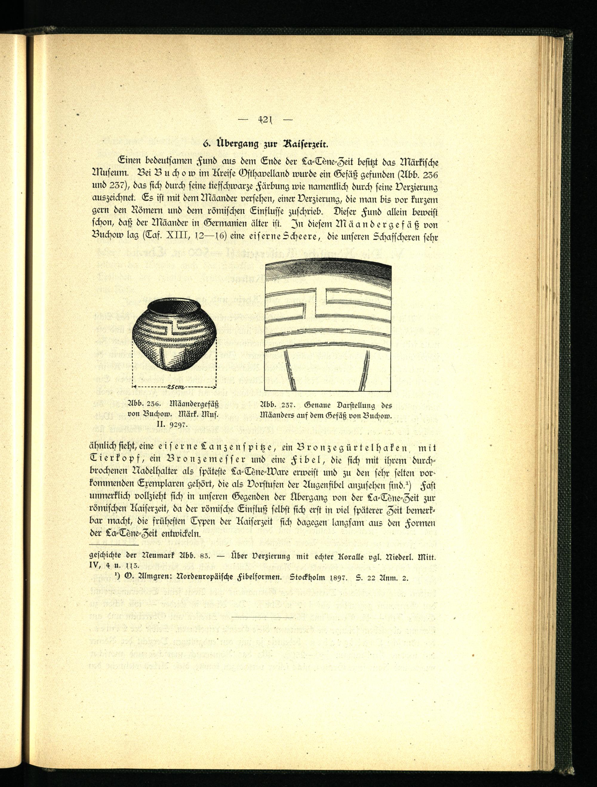Einen bedeutsamen Fund aus dem Ende der La-Tdne-Zeit besitzt das Märkische Museum. Bei Buchowim Kreise Gsthavelland wurde ein Gefäß gefunden (Abb. 236 und 237), das sich durch seine tiefschwarze Färbung wie namentlich durch seine Verzierung auszeichnet. Es ist mit dem Mäander versehen, einer Verzierung, die man bis vor kurzem gern den Römern und dem römischen Einflüsse zuschrieb. Dieser Fund allein beweist schon, daß der Mäander in Germanien älter ist. In diesem Mäandergefäß von Buchow lag (Taf. XIII, 12—16) eine eiserne Scheere, die unseren 5chafscheren sehr