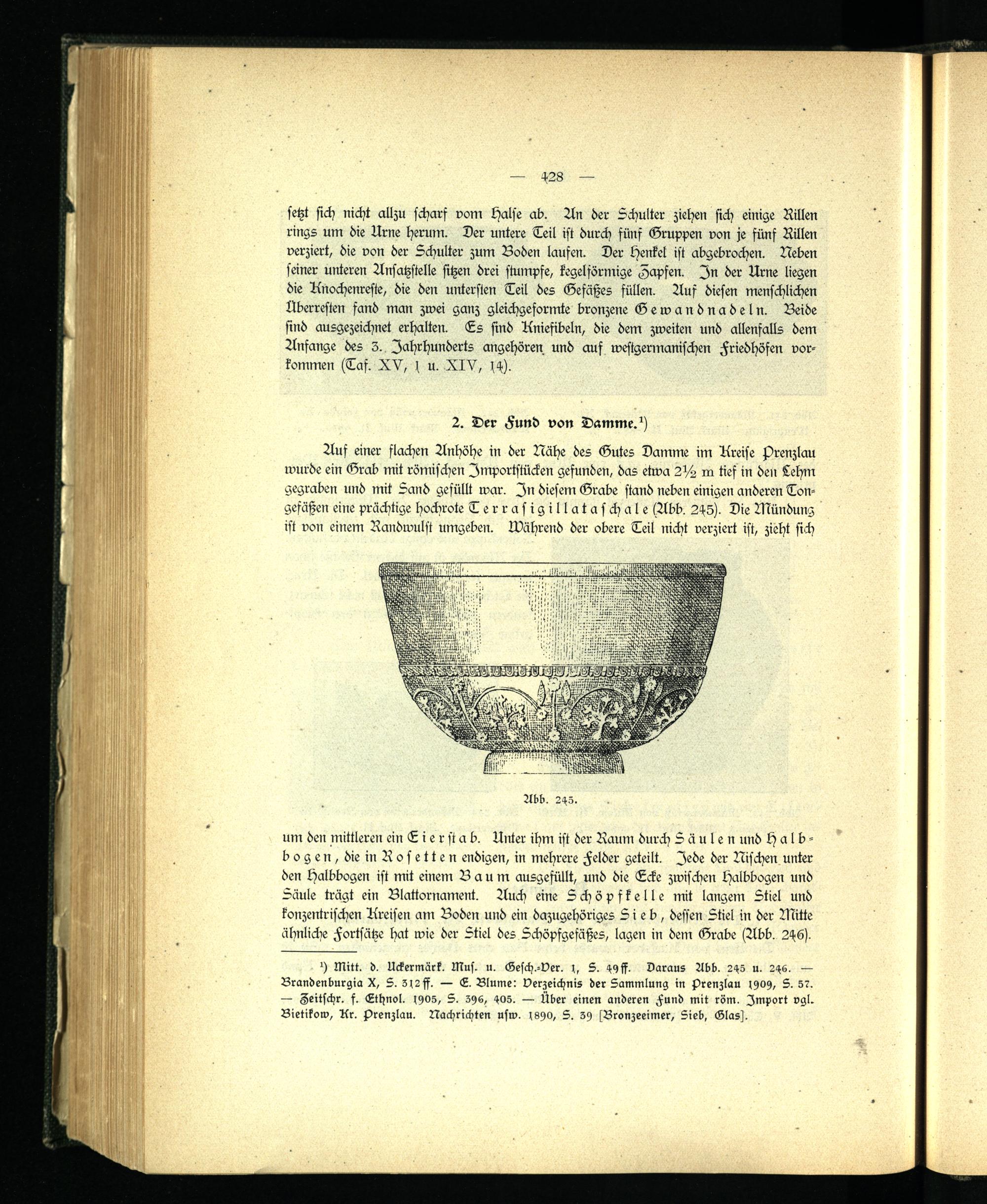 Auf einer flachen Anhöhe in der Nähe des Gutes Damme im Ureise Hrenzlau wurde ein Grab mit römischen Zmportstücken gefunden, das etwa 2fch m tief in den Lehm gegraben und mit Sand gefüllt war. Zn diesem Grabe stand neben einigen anderen Tongefäßen eine prächtige hochrote Terrasigillataschale iAbb. 245 ). Die Mündung ist von einem Randwulst umgeben. Während der obere Teil nicht verziert ist, zieht sich