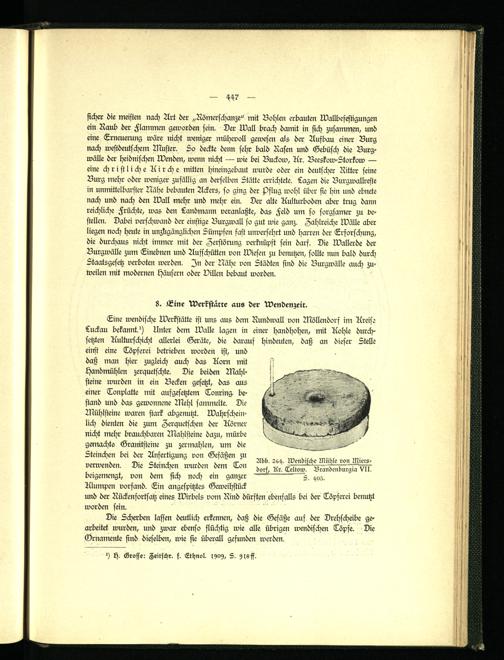 Eine wendische Werkstätte ist uns aus dem Rundwall von Wöllendorf im Areise Luckau bekannt?) Unter dem Walle lagen in einer handhohen, mit Aohle durchsetzten Aulturschicht allerlei Geräte, die darauf hindeuten, daß an dieser Stelle einst eine Töpferei betrieben worden ist, und daß man hier zugleich auch das Aorn mit Handmühlen zerquetschte. Die beiden Mahlsteine wurden in ein Becken gesetzt, das aus einer Tonplatte mit aufgesetztem Tonring bestand und das gewonnene Wehl sammelte. Die Wühlsteine waren stark abgenutzt. Wahrscheinlich dienten die zum Zerquetschen der Aörner nicht mehr brauchbaren Wahlsteine dazu, mürbe gemachte Granitsteine zu zermahlen, um die Steinchen bei der Anfertigung von Gefäßen zu verwenden. Die Steinchen wurden dem Ton beigemengt, von dem sich noch ein ganzer Alumpen vorfand. Ein angespitztes Geweihstück und der Rückenfortsatz eines Wirbels vom Rind dürften ebenfalls bei der Töpferei benutzt worden sein.