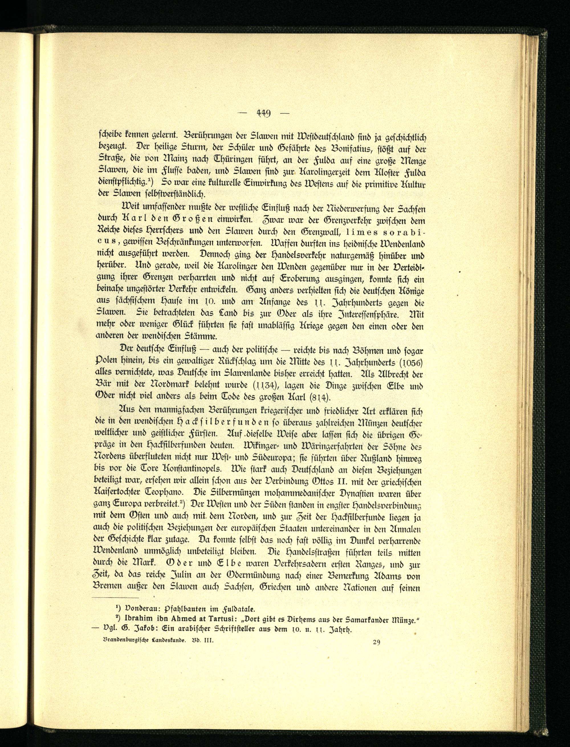 Aus den mannigfachen Berührungen kriegerischer und friedlicher Art erklären sich die in den wendischen Hacksilber fun den so überaus zahlreichen Münzen deutscher weltlicher und geistlicher Fürsten. Auf-dieselbe Weise aber lassen sich die übrigen Gepräge in den Hacksilberfunden deuten. Wikinger- und Wäringerfahrten der Söhne des Nordens überfluteten nicht nur West- und Südeuropa; sie führten über Rußland hinweg bis vor die Tore Konstantinopels. Wie stark auch Deutschland an diesen Beziehungen beteiligt war, ersehen wir allein schon aus der Verbindung Ottos II. mit der griechischen Kaisertochter Teophano. Die Silbermünzen mohammedanischer Dynastien waren über ganz Guropa verbreitet?) Der Westen und der Süden standen in engster Handelsverbindung mit dem Osten und auch mit dem Norden, und zur Zeit der Hacksilberfunde liegen ja auch die politischen Beziehungen der europäischen Staaten untereinander in den Annalen der Geschichte klar zutage. Da konnte selbst das noch fast völlig im Dunkel verharrende Wendenland unmöglich unbeteiligt bleiben. Die Handelsstraßen führten teils mitten durch die Mark. Oder und Glbe waren Verkehrsadern ersten Ranges, und zur Zeit, da das reiche Iulin an der Odermündung nach einer Bemerkung Adams von Bremen außer den Slawen auch Sachsen, Griechen und andere Nationen auf seinen