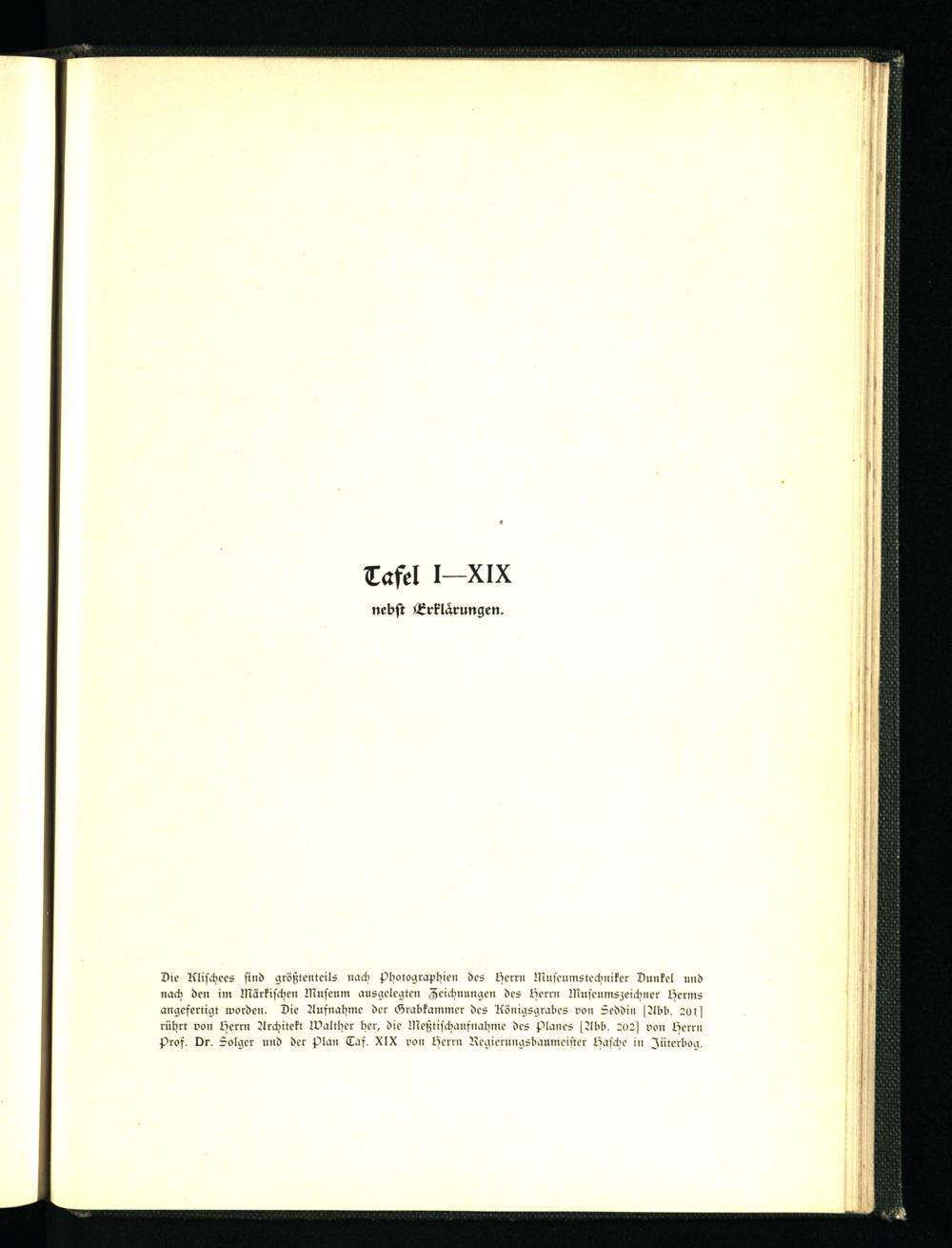 Die Klischees sind größtenteils »ach Photographien des Perm Museumstcchniker Dunkel und nach den im Märkischen Museum ausgclegten Zeichnungen des Perm Museumszeichncr Perms angesertigt worden. Die Ausnahme der Grabkammcr des Rönigsgrabcs von Seddin sAl'b. 20 ts rührt von Perm Architekt Walther her, die Meßtischausnahmc des planes sAbl>. 202s von Perm Pros. Or. Solger und der plan Tas. XIX von Perm Regicrungsbaumcistcr pasche in Jüterbog.
